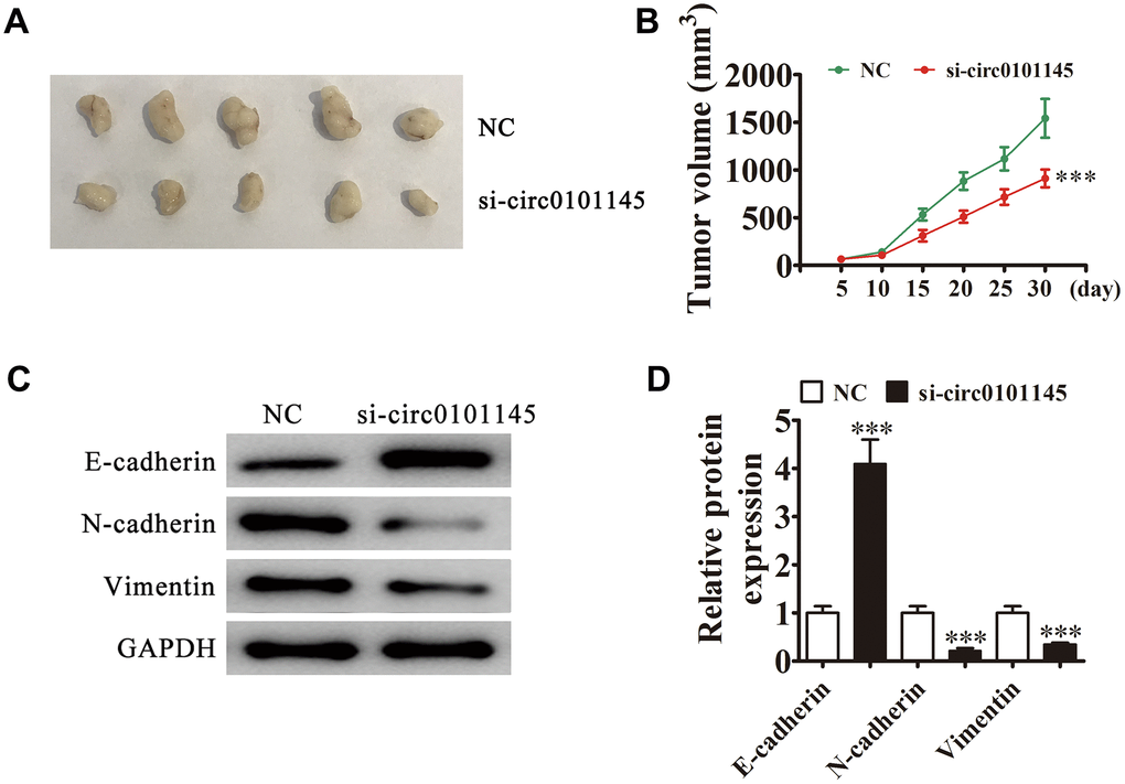 We employed xenograft mouse models to verify the effects of hsa_circ_0101145 on tumor growth in vivo. We inoculated nude mice with hsa_circ_0101145-silenced (si-circ0101145) or NC HepG2 cells. After one month, we harvested the xenografts as demonstrated in Figure 3A. We detected smaller tumors in mice injected with si-circ0101145 HepG2 cells, but observed larger xenografts in mice inoculated with wild-type cells. Xenografts grew slower in volume in the si-circ0101145 group (Figure 3B). Western blotting revealed that knockdown of hsa_circ_0101145 promoted E-cadherin expression, but decreased N-cadherin and vimentin expression (Figure 3C and 3D). In summary, the above data showed that hsa_circ_0101145 knockdown suppressed HCC proliferation in vitro and in vivo.