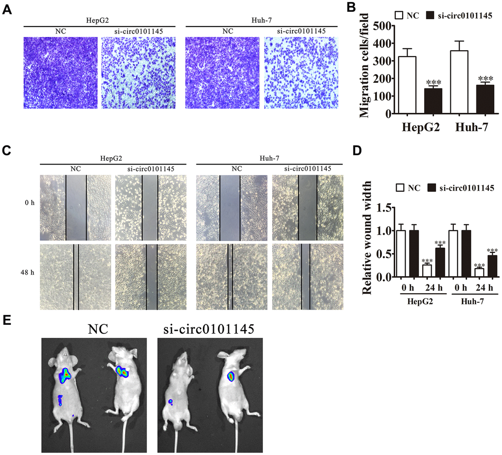 We then studied the effects of hsa_circ_0101145 on HCC invasiveness. In vitro experiments using the Transwell assay confirmed that hsa_circ_0101145 knockdown suppressed cell migration in both HepG2 and Huh-7 cells (Figure 4A and 4B). Wound-healing assays demonstrated that hsa_circ_0101145 depletion decreased the invasion of both HepG2 and Huh-7 cells (Figure 4C and 4D). Following 30 days of intravenous tail injection of HepG2 cells with or without hsa_circ_0101145 knockdown, the metastatic ability of HepG2 cells was decreased with hsa_circ_0101145 silencing, as determined by live cell imaging (Figure 4D). The data indicated that hsa_circ_0101145 knockdown suppressed HCC invasion both in vitro and in vivo.