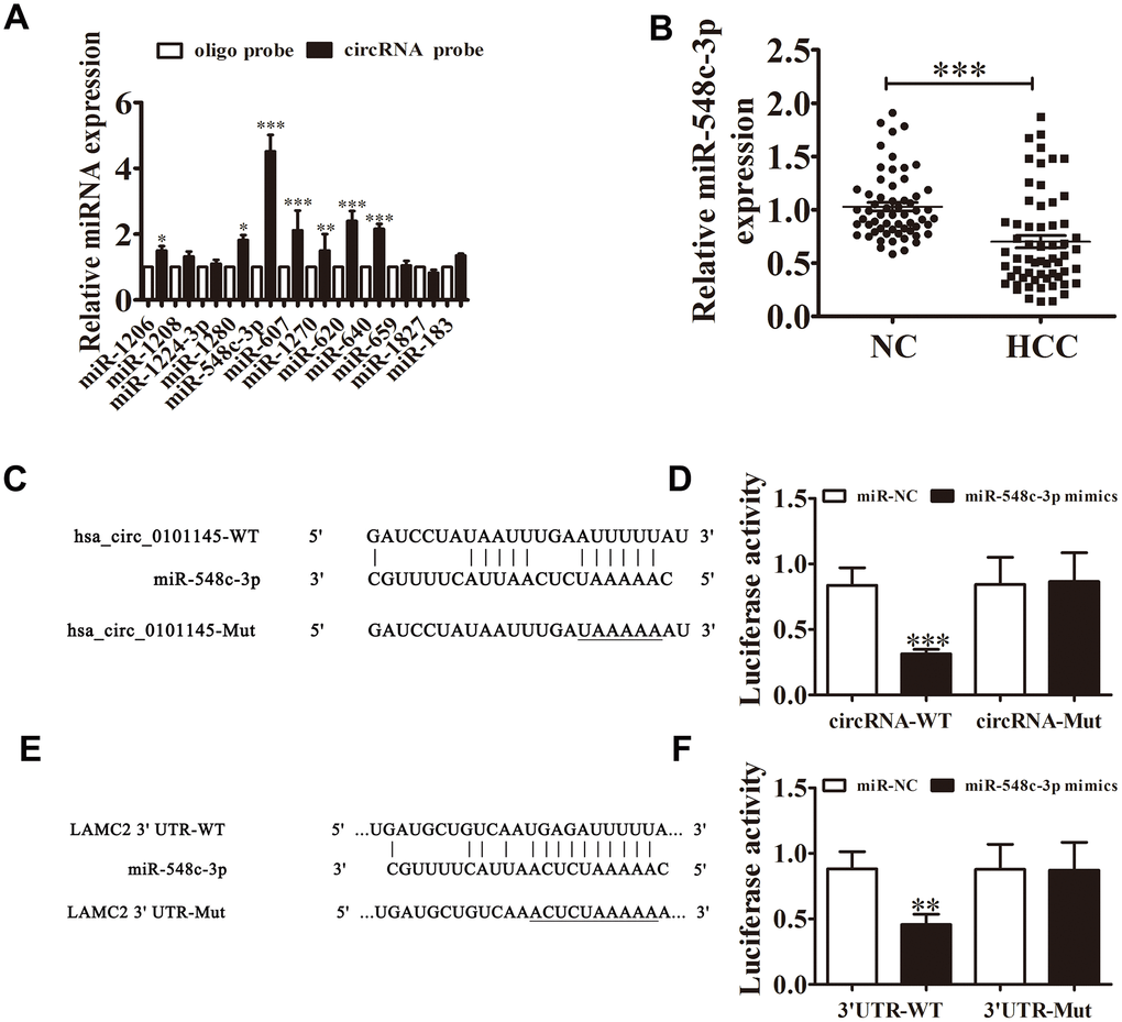 Bioinformatics analysis validated that miR-548c-3p was a downstream target of hsa_circ_0101145. To validate the connection between miR-548c-3p and hsa_circ_0101145, we constructed mutated and wild-type hsa_circ_0101145 sequences including the miR-548c-3p binding sequence into a luciferase reporter vector (Figure 5C). We then transfected this luciferase reporter vector into 293T cells in the presence or absence of a miR-548c-3p mimic. Luciferase reporter assay results indicated that miR-548c-3p inhibited luciferase activity in wild-type cells but not in mutated cells (Figure 5D), indicated that miR-548c-3p is a target of hsa_circ_0101145. Bioinformatics analysis also revealed that LAMC2 is a downstream target of miR-548c-3p (Figure 5E); luciferase reporter analysis confirmed that miR-548c-3p can interact with the LAMC2 3’UTR (Figure 5F), suggesting that hsa_circ_0101145 promotes HCC cell invasion and proliferation by sponging miR-548c-3p.