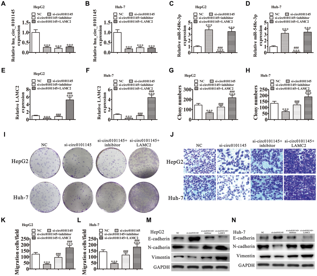 Downregulation of hsa_circ_0101145 was confirmed by RT-qPCR. Downregulation of miR-548c-3p or LAMC2 overexpression did not restore hsa_circ_0101145 levels in Huh-7 or HepG2 cells (Figure 6A and 6B), suggesting that both miR-548c-3p and LAMC2 are downstream targets of hsa_circ_0101145. We also found that hsa_circ_0101145 silencing promoted miR-548c-3p expression, while treatment with a miR-548c-3p specific inhibitor or miR-548c-3p expression even after silencing of hsa_circ_0101145. Overexpression of LAMC2 did not influence miR-548c-3p expression (Figure 6C and 6D). RT-qPCR showed that silencing of hsa_circ_0101145 decreased LAMC2 expression while inhibition of miR-548c-3p restored the levels of LAMC2 following silencing of hsa_circ_0101145 in both HepG2 and Huh-7 cells (Figure 6E and 6F). These results confirmed that hsa_circ_0101145 regulated LAMC2 expression by sponging miR-548c-3p. Colony formation (Figure 6G–6I) and Transwell (Figure 6I–6L) assays showed that miR-548c-3p downregulation or LAMC2 overexpression recovered the migration and proliferation abilities of both Huh-7 and HepG2 cells after hsa_circ_0101145 silencing, suggesting that hsa_circ_0101145 promoted HCLC cell migration and proliferation by sponging miR-548c-3p. Western blot analysis demonstrated that miR-548c-3p downregulation or LAMC2 overexpression recovered the EMT in both HepG2 (Figure 6M) and Huh-7 (Figure 6N) cells after hsa_circ_0101145 silencing.