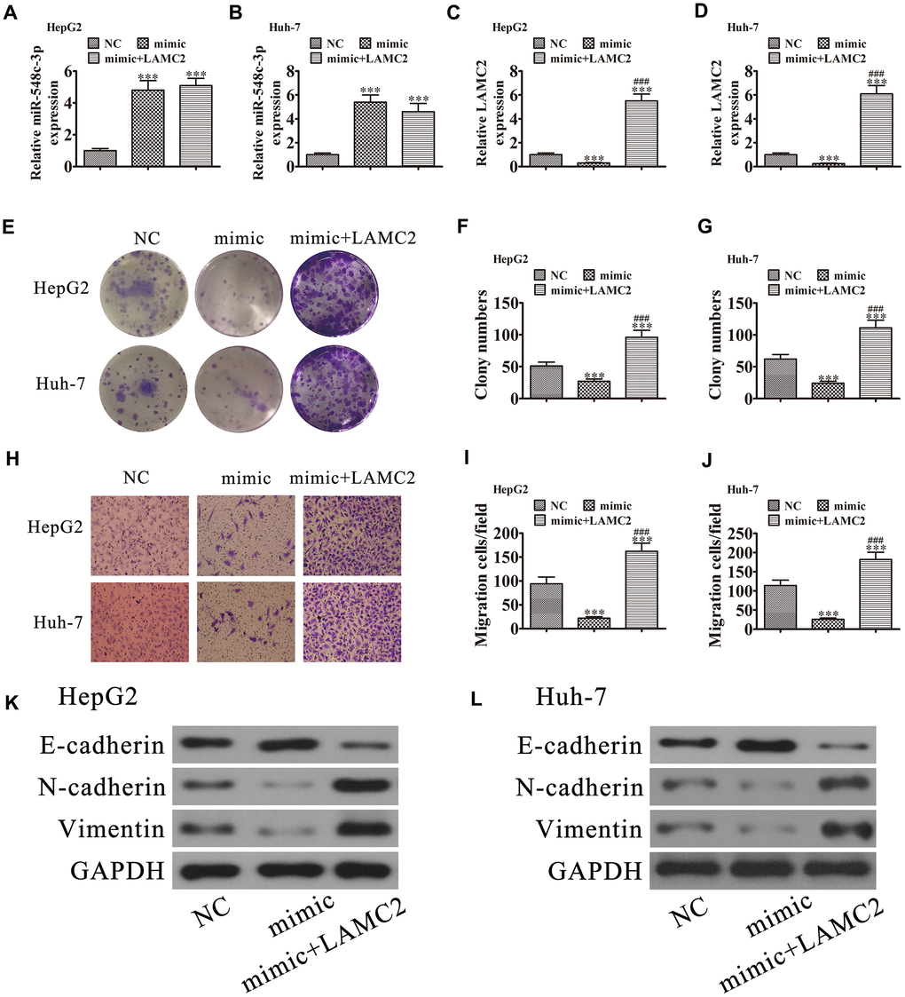 RT-qPCR demonstrated that miR-548c-3p expression was increased in Huh-7 and HepG2 cells following transfection with miR-548c-3p mimics. Upregulation of LAMC2 could not restore miR-548c-3p expression (Figure 7A and 7B), suggesting that LAMC2 is a downstream target of miR-548c-3p. RT-qPCR revealed that miR-548c-3p overexpression decreased LAMC2 expression in HepG2 and Huh-7 cells, but after transfection with a LAMC2 overexpression vector promoted LAMC2 expression (Figure 7B and 7C). Colony formation (Figure 7E–7G) and Transwell (Figure 7H–7J) assays illustrated that LAMC2 overexpression restored HepG2 and Huh-7 cell proliferation and migration abilities following upregulation of miR-548c-3p. Western blot analysis showed that upregulation of LAMC2 recovered the EMT in both HepG2 (Figure 7K) and Huh-7 (Figure 7L) cells after overexpression of miR-548c-3p.