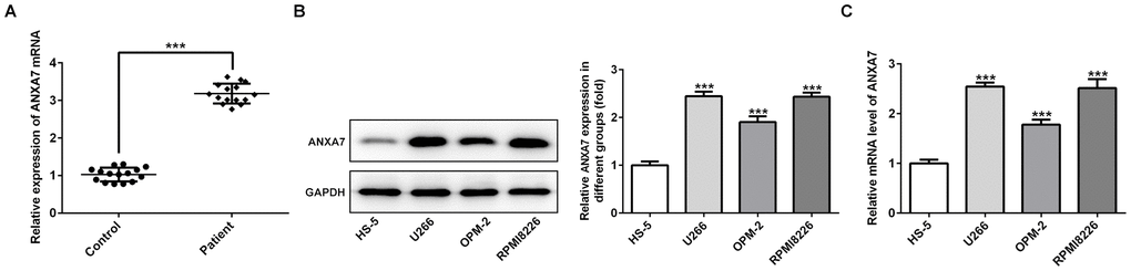The mRNA expression of ANXA7 was up-regulated in the serum of MM patients compared with that in healthy donors (Figure 1A). As shown in Figure 1B and 1C, the mRNA expression and protein expression of ANXA7 was increased in U266, OPM-2 and RPMI-8226 cells compared with HS-5 cells. U266 and PRMI-8266 cells with high expression of ANXA7 were selected for the following experimental study.