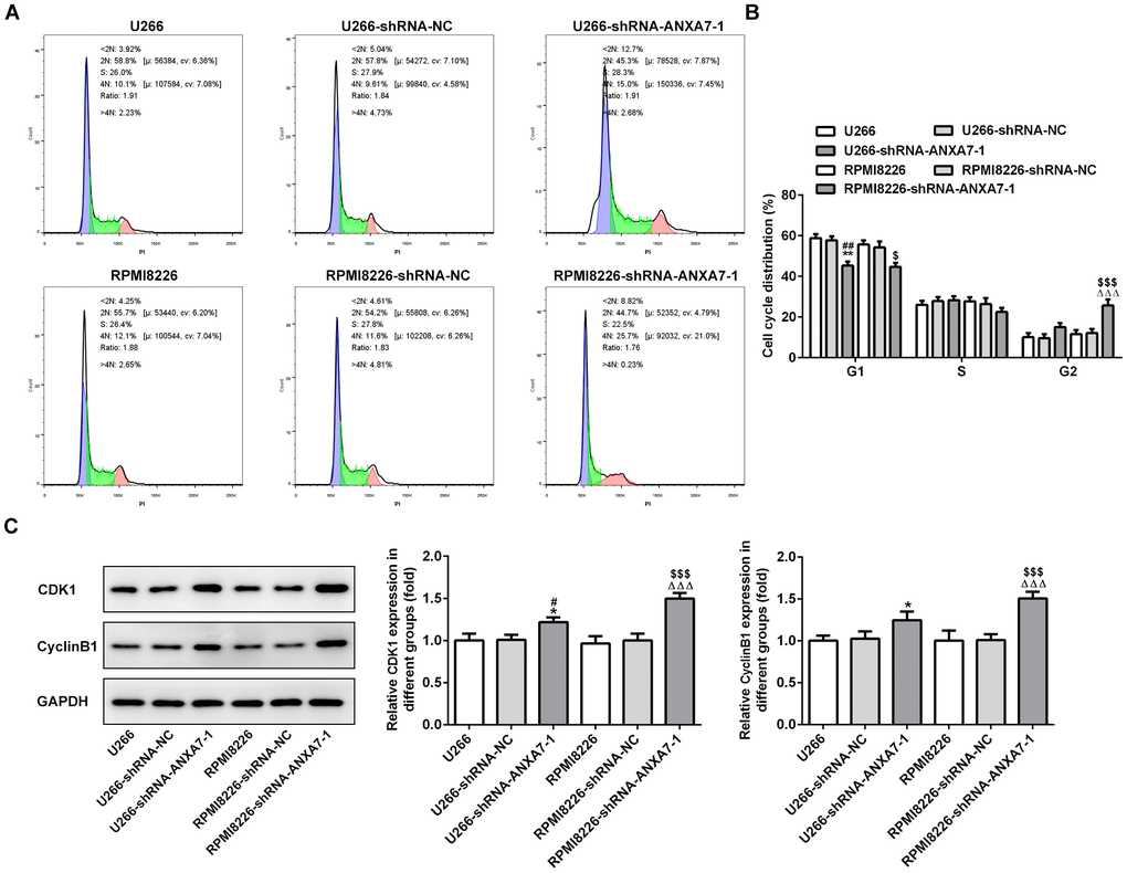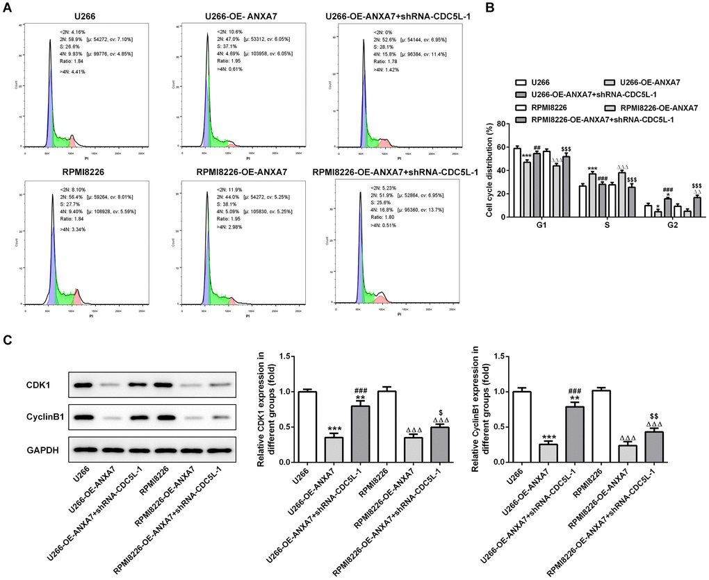 Here, we aimed to investigate whether ANXA7 interference could promote cell cycle arrest in G2/M phase through CDC5L to inhibit proliferation of MM cells and reduce cell adhesion-mediated drug resistance. It was shown that ANXA7 interference could promote cell cycle arrest in G2/M phase through CDC5L to inhibit proliferation of MM cells and reduce cell adhesion-mediated drug resistance.