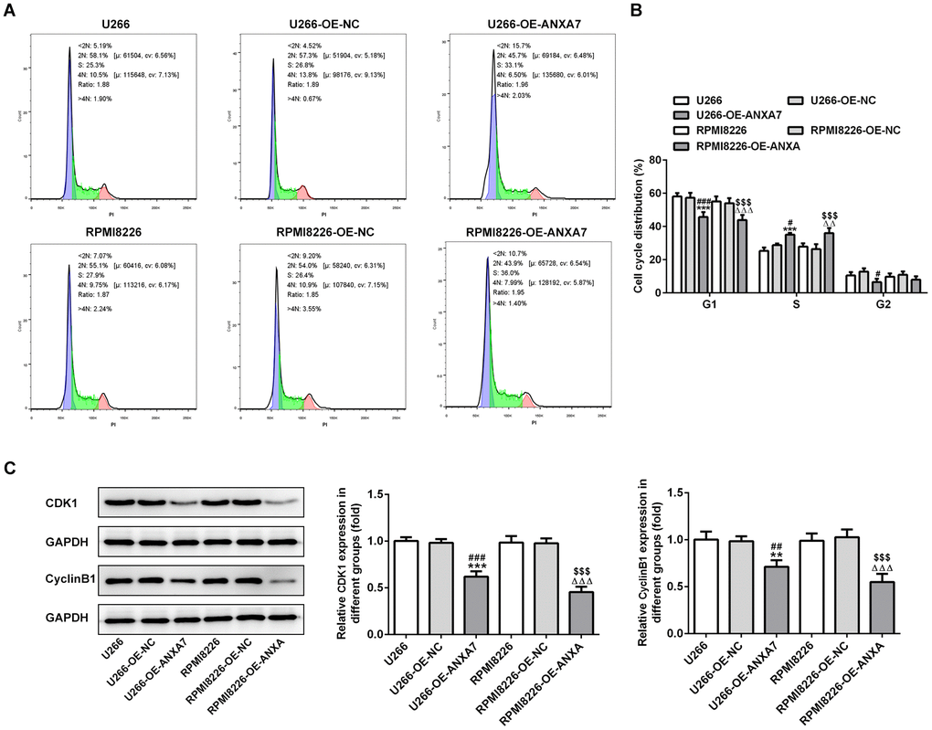 After U266 and RPMI8226 cells transfected with OE-ANXA7, ANXA7 overexpression shortened the G0/G1 phase and G2/M phase while extended the S phase (Figure 3A and 3B). As shown in Figure 3C, the protein expression of CDK1 and cyclinB1 was decreased when U266 and RPMI8226 cells were transfected with overexpression-ANXA7.