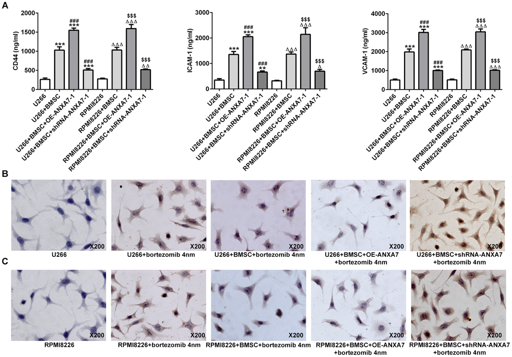 By co-culture of cell-cell contact with BMSC cells, the expression of CD44, ICAM1 and VCAM1 was all increased in U266 and RPMI8226 cells, which was further increased by ANXA7 overexpression and inhibited by ANXA7 interference (Figure 6A). When U266 and RPMI8226 cells were treated with bortezomib, the cell apoptosis was increased. However, by co-culture with BMSC cells, the apoptosis-promoting effect of bortezomib on U266 and RPMI8226 cells was weakened. Furthermore, ANXA7 overexpression further inhibited the apoptosis-promoting effect of bortezomib on U266 and RPMI8226 cells while ANXA7 interference made the cells more sensitive to bortezomib, thereby promoting the cell apoptosis (Figure 6B and 6C).