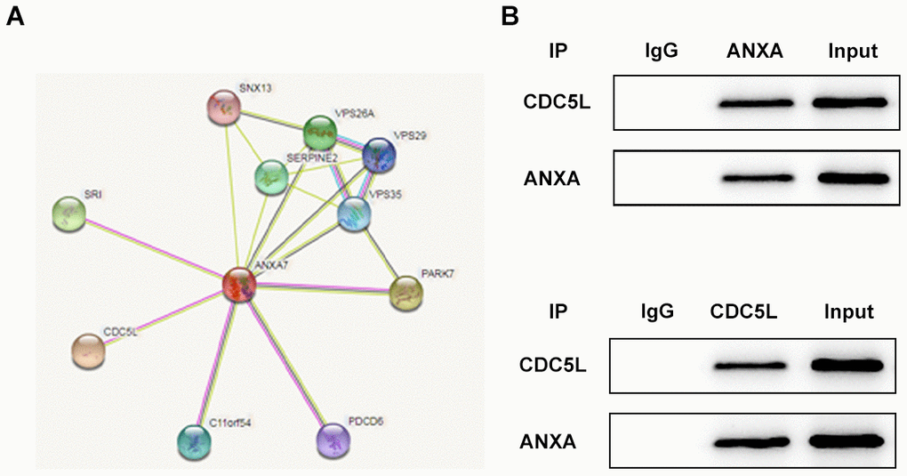 The string database predicts that ANXA7 can bind to CDC5L and CDC5L is a cell cycle regulator protein associated with the G2/M phase (Figure 7A). As shown in Figure 7B, the protein expression of CDC5L was existed in anti-ANXA group and the protein expression of ANXA was existed in anti-CDC5L group, which showed that CDC5L was combined with ANXA.
