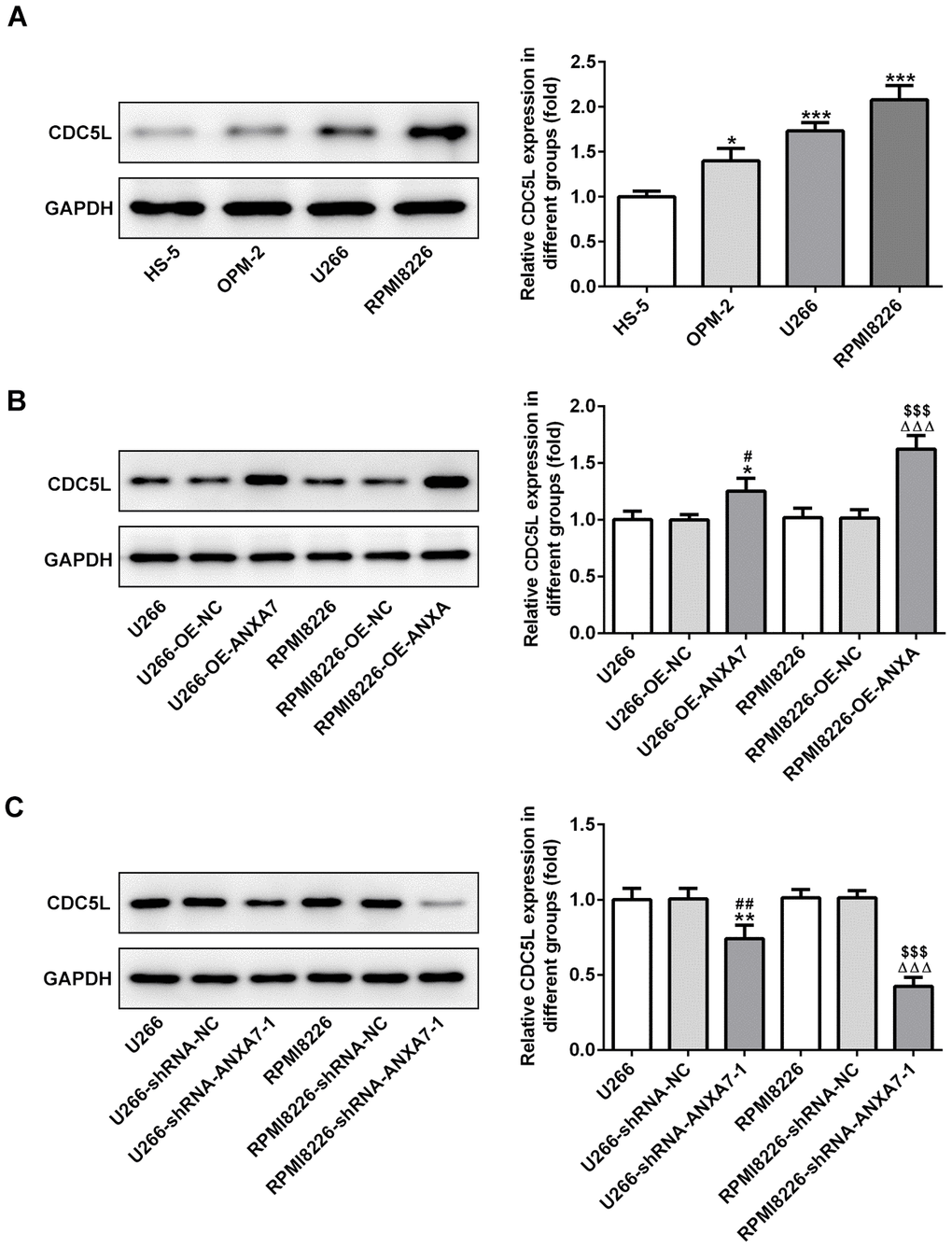 The protein expression of CDC5L was increased in U266, OPM-2 and RPMI-8226 cells compared with HS-5 cells (Figure 8A) and U266 and RPMI-8226 cells were selected for the subsequent experiment. When U266 and RPMI-8226 cells were transfected with OE-ANXA7, the protein expression of CDC5L was up-regulated in U266 and RPMI-8226 cells compared with OE-NC transfected cells (Figure 8B). When U266 and RPMI-8226 cells were transfected with shRNA-ANXA7-1, the expression of CDC5L was down-regulated in U266 and RPMI-8226 cells compared with OE-NC transfected cells (Figure 8C).