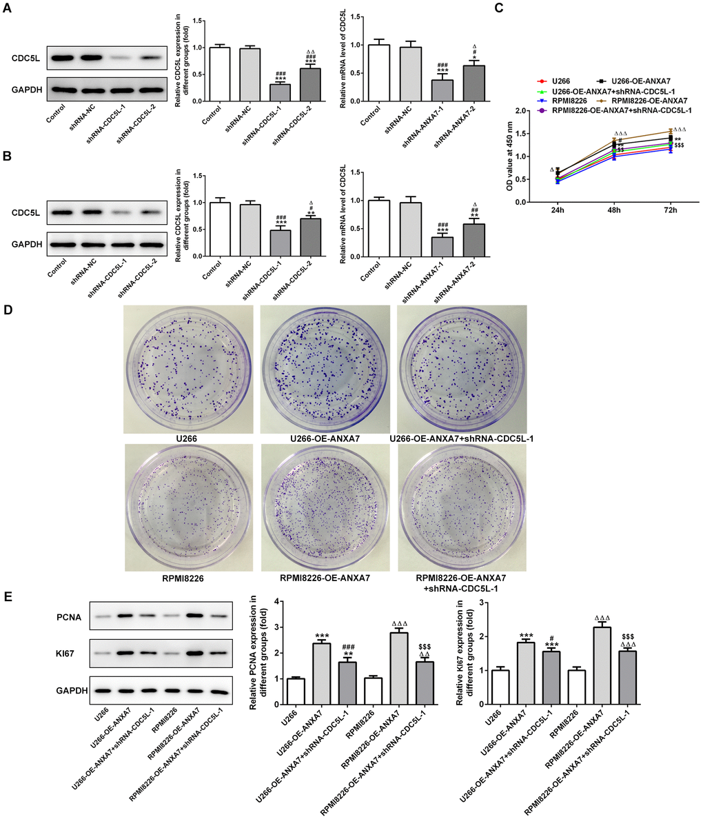 After U266 and RPMI-8226 cells were transfected with shRNA-CDC5L-1 and shRNA- CDC5L-2, the protein expression of CDC5L was decreased. The protein expression of CDC5L in shRNA-CDC5L-1 group was lower than that in shRNA-CDC5L-2 group. Therefore, shRNA-CDC5L-1 was chosen for the subsequent experiment (Figure 9A and 9B). As shown in Figure 9C, ANXA7 overexpression promoted the proliferation activity of U266 and RPMI-8226 cells while CDC5L interference could inhibited the proliferation promotion effect of ANXA7 on U266 and RPMI-8226 cells, which confirmed by the result of colony formation assay (Figure 9D). The protein expression of proliferation related proteins (PCNA and KI67) was increased in U266 and RPMI-8226 cells transfected with OE-ANXA7. However, CDC5L interference reduced the protein expression of PCNA and KI67 in U266 and RPMI-8226 cells transfected with OE-ANXA7 (Figure 9E).