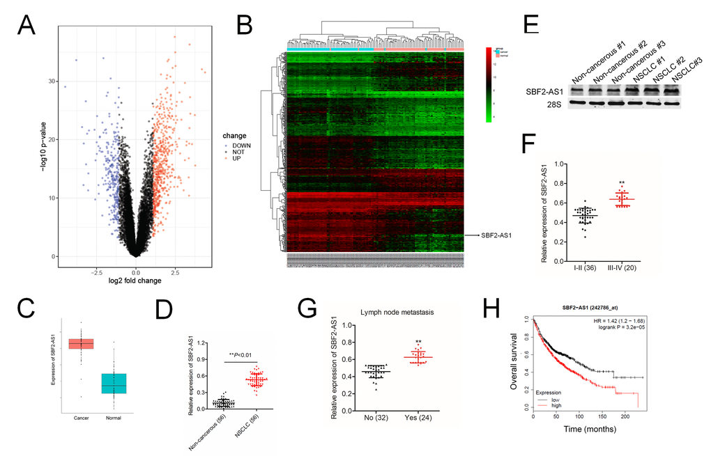 To find the potential involvement of lncRNAs in NSCLC, we performed global gene expression analysis using GEO database (the accession codes GSE19804). The upregulated lncRNAs and downregulated lncRNAs were summarized in the volcano plot (Figure 1A) and heat map (Figure 1B). Among all 5966 differential lncRNAs, there are 518 lncRNAs down-regulated and 1280 lncRNAs up-regulated in our observation on the alterations of lncRNAs expression between lung cancer and control tissues. Among these differentially expressed lncRNAs, we focus on lncRNA SBF2-AS1, due to its unknown precise biological function in NSCLC. The level of SBF2-AS1 is significantly upregulated in lung cancer from GSE19804 dataset (Figure 1C). We further detected the expression levels of SBF2-AS1 in 56 cases of clinical NSCLC samples and non-cancerous samples by using qRT-PCR. As shown in Figure 1D, SBF2-AS1 was markedly overexpressed in NSCLC tissues. Meanwhile, northern blot assay shown that SBF2-AS1 was overexpressed in human NSCLC tissue compared to in corresponding non-cancerous tissue (Figure 1E). Furthermore, the higher level of SBF2-AS1 was allied to the aggressive phenotypes of NSCLC (Figure 1F–1G and Supplementary Table 1). Finally, we confirmed that high level of SBF2-AS1 was a predictor for the poor overall survival (OS) of NSCLC patients by using Kaplan-Meier plotter (www.kmplot.com) (Figure 1H). Overall, these data showed that SBF2-AS1 was overregulated in NSCLC and might exert essential roles during the progression of NSCLC.