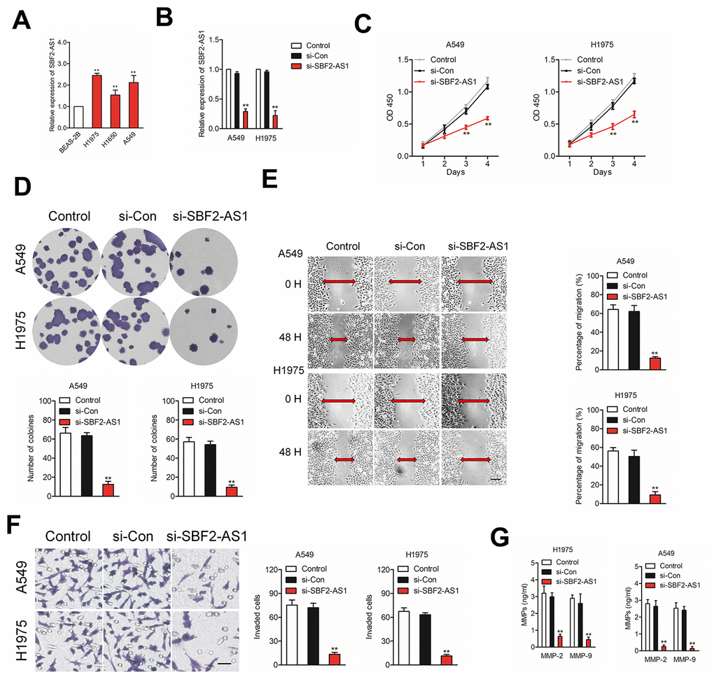 In order to clarify the effects of SBF2-AS1, we firstly explored the level of SBF2-AS1 in non-neoplastic human bronchial epithelial cell line, BEAS-2B and NSCLC cell lines (H1975, A549 and H1650). As shown in Figure 2A, the results of qRT-PCR assay indicated that SBF2-AS1 was significantly upregulated in H1975 and A549 cell compared with that in BEAS-2B cell. Then, we knock-downed SBF2-AS1 in H1975 and A549 cell by using siRNA targeting SBF2-AS1 (Figure 2B). The CCK-8 assay indicated that NSCLC cell proliferation was significantly restrained after SBF2-AS1 silencing (Figure 2C). Consistently, the colony formation abilities of NSCLC cell were dramatically restrained after transfection with si-SBF2-AS1 (Figure 2D). Additionally, the migration and invasion abilities were markedly inhibited in A549 or H1975 cell transfected with si-SBF2-AS1 as demonstrated by wound-healing (Figure 2E) and Transwell assays (Figure 2F). Simultaneously, we observed that overexpression of lncRNA SBF2-AS1 enhanced NSCLC cell growth and invasion in vitro (Supplementary Figure 1). Finally, the secreted MMP-2 and MMP-9 were analyzed by ELISA. As shown in Figure 2G, the secretion of MMP-2 and MMP-9 were significantly reduced by si-SBF2-AS1 transfection in both A549 and H1975 cell. All these findings indicated the carcinogenicity of SBF2-AS1 in human NSCLC.