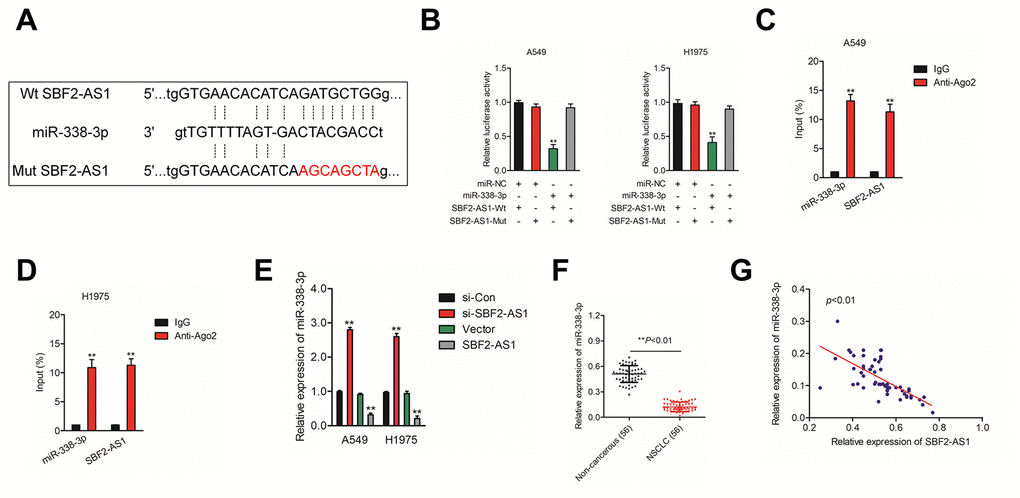 Increasing evidences have indicated that lncRNAs acts as ceRNAs competitively share miRNAs recognition sites with mRNAs to regulate the expressions of cancer-related genes. To find the potential target miRNAs of SBF2-AS1, Starbase website (http://starbase.sysu.edu.cn/) was applied to find the possible miRNAs that interact with SBF2-AS1. As show in Figure 3A, miR-338-3p has putative binding sites with SBF2-AS1. The following luciferase reporter gene analysis implied that luciferase activity in NSCLC cell transfected with pmirGLO vector carrying SBF2-AS1-Wt was remarkably reduced by miR-338-3p (Figure 3B). Moreover, the RIP assay shown that both miR-338-3p and SBF2-AS1 were enriched in Ago2 containing beads (Figure 3C–3D). In order to illuminate the relationship between miR-338-3p and SBF2-AS1, A549 and H1975 cell were transfected with si-SBF2-AS1 or pcDNA-SBF2-AS1. As shown in Figure 3E, downregulation of SBF2-AS1 increased the level of miR-338-3p and miR-338-3p was markedly suppressed in pcDNA-SBF2-AS1 transfected A549 and H1975 cell. Next, we revealed that miR-338-3p was downregulated in NSCLC tissues when comped with that in normal tissues (Figure 3F). Importantly, the level of miR-338-3p was negatively associated with SBF2-AS1 level in NSCLC tissues (Figure 3G). Altogether, these findings revealed that SBF2-AS1 bound with miR-338-3p and negatively modulated its level in NSCLC.