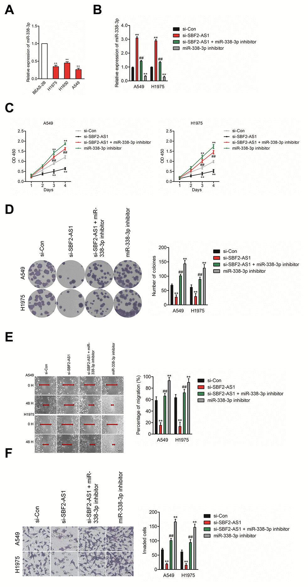 To explore the impacts of SBF2-AS1/miR-338-3p axis on NSCLC cell, we then explored the level of miR-338-3p in normal (non-neoplastic) human bronchial epithelial cell BEAS-2B and NSCLC cell lines (A549, H1975 and H1650). The results of qRT-PCR indicated that miR-338-3p was significantly downregulated in NSCLC cell lines compared than in BEAS-2B cell (Figure 4A). Furthermore, A549 or H1975 cell were transfected with. si-SBF2-AS1 or si-SBF2-AS1 combination with miR-338-3p inhibitor (Figure 4B). The cell proliferation and colony formation assay indicated that downregulation of miR-338-3p abrogated the inhibitory impacts of si-SBF2-AS1 on the growth of NSCLC cell in vitro (Figures 4C–4D). Meanwhile, the wound healing and Transwell invasion assay shown that downregulation of miR-338-3p reversed abolished the suppressive impacts of si-SBF2-AS1 on the migrate and invasive abilities of NSCLC cell in vitro (Figures 4E–4F). All these observations suggest that downregulation of SBF2-AS1 inhibits NSCLC cell metastatic ability via regulating miR-338-3p