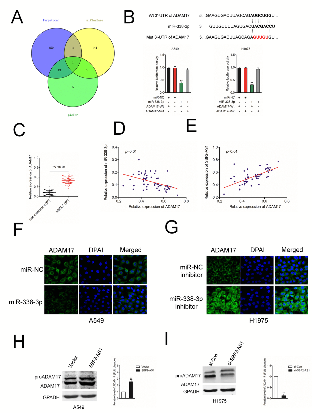 Increasing reports demonstrate the ceRNA hypothesis, which reveals lncRNAs are involved into lncRNAs-miRNAs-mRNAs crosstalk. We firstly verified ADAM17 as a downstream target gene of miR-338-3p by using three bioinformatics software (TargetScan, miRTarBase and picTar) (Figure 5A). The following luciferase reporter gene analysis validated miR-338-3p bound with the 3’-UTR of ADAM17 (Figure 5B). Additionally, the expressions of ADAM17 in NSCLC samples were higher compared with in noncancerous tissues (Figure 5C). The Pearson correlation analysis indicated that miR-338-3p level was inversely associated with the expression of ADAM17 in NSCLC tissues (Figure 5D). Nevertheless, ADAM17 was positively related with SBF2-AS1 level in NSCLC samples (Figure 5E). In addition, we observed that the protein level of ADAM17 was significantly reduced in A549 cell transfected with miR-338-3p (Figure 5F). Nevertheless, miR-338-3p inhibitor raised the expression of ADAM17 in H1975 cell (Figure 5G). Furthermore, the protein level of ADAM17 was significantly raised in A549 cell transfected with SBF2-AS1 overexpression plasmid (Figure 5H) and si-SBF2-AS1 decreased the expression of ADAM17 in H1975 cell (Figure 5I). Early reports have indicated that ADAM8 also promotes cancer development and metastasis in a variety of tumor types [20–23]. We also analyzed the effect of SBF2-AS1 or miR-338-3p on the expression of ADAM8 in A549 cell. As shown in Supplementary Figure 2A, after transfected with si-SBF2-AS1 or miR-338-3p, the expression of ADAM8 was not significantly reduced, which indicating ADAM8 was not the potential downstream target of SBF-AS1 or miR-338-3p. In, addition, A549 cell was transfected with si-ADAM8 alone or cotransfected with si-ADAM8 and miR-338-3p. The expression of ADAM8 was assessed by western blot (Supplementary Figure 2B). After that, the migration and invasion abilities were significantly inhibited by si-ADAM8. Nevertheless, the suppressive effect of miR-338-3p on the aggressive traits was not impaired in the presence of si-ADAM8, which suggested that miR-338-3p regulated the migration and invasion of NSCLC cell in an ADAM8-independent manner (Supplementary Figure 2B).