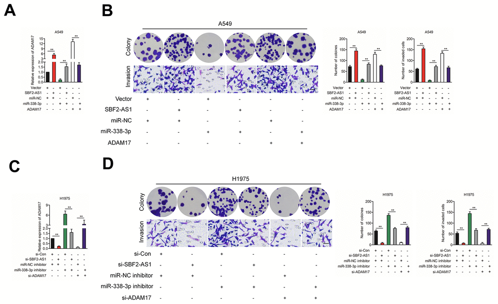 Finally, SBF2-AS1, ADAM17 and miR-338-3p were cotransfected into A549 cell, the protein expression of ADAM17 in A549 cell was measured by using qRT-PCR assay (Figure 6A). Then, the growth and invasion capacities were analyzed (Figure 6B). We found that overexpression of SBF2-AS1 or ADAM17 increased the colony formation and invasion abilities in A549 cell. Transfected with miR-338-3p reversed the impacts of SBF2-AS1 or ADAM17 on the aggressiveness of H1975 cell. H1975 cell was transfected with si-SBF2-AS1, si-ADAM17 and miR-338-3p inhibitor, the protein expression of in A549 cell was measured by using qRT-PCR assay (Figure 6C). Transfected with miR-338-3p inhibitor reversed the suppressive impacts of si-SBF2-AS1 or si-ADAM17 on the aggressiveness of H1975 cell (Figure 6D). Altogether, these results suggested that SBF2-AS1 regulated ADAM17 in NSCLC by serving as a molecular sponge to regulate miR-338-3p.