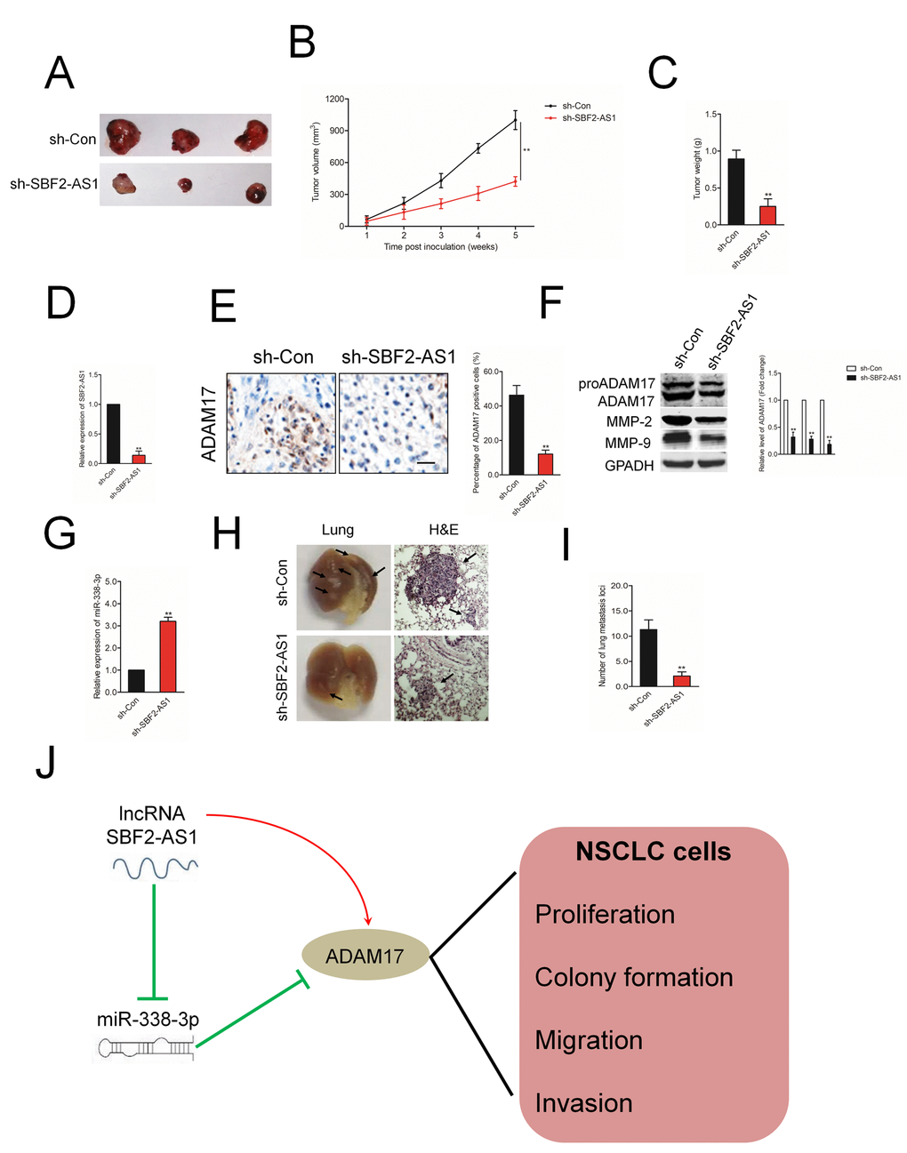 In order to confirm the role of SBF2-AS1 on NSCLC cell growth in vivo, A549 cell was stable transfected with sh-SBF2-AS1 or sh-Con and inoculated into nude mice to construct xenograft models. As showed in Figures 8A–8C, downregulation of SBF2-AS1 drastically restrained both tumor growth and tumor weight in mice injected with sh-SBF2-AS1 transfected A549 cell. Meanwhile, when compared with the sh-Con group, the mice injected with sh-SBF2-AS1 transfected A549 cell exhibited a significantly lower relative tumor volumes (RTV) (Supplementary Figure 3). Meanwhile, the T/C %=37.6% (less than 60%). All these findings indicated that downregulation of SBF2-AS1 restrained the tumor growth of A549 cell growth in vivo. The levels of SBF2-AS1 in tumor tissues were further assessed using qRT-PCR assay. As shown in Figure 8D, the level of SBF2-AS1 was significantly lower in tumor tissue formed by sh-SBF2-AS1 transfected A549 cell compared with that in tumor tissue formed by sh-Con transfected A549 cell. Moreover, ADAM17 immunohistochemistry (IHC) staining assay shown that ADAM17 positive staining was suppressed in the sh-SBF2-AS1 group (Figure 8E). The results of western blotting assay indicated that the expressions of MM-P2/9 and ADAM17 were significantly reduced in sh-SBF2-AS1 group (Figure 8F). Nevertheless, the level of miR-338-3p was remarkably raised sh-SBF2-AS1 group (Figure 8G). Finally, we investigated whether downregulation of SBF-AS1 would also affect the metastatic behavior of A549 cell in vivo. sh-Con or sh-SBF-AS1 transfected A549 cells were inoculated into nude mice through the lateral tail vein. After twelve weeks, lung metastasis was apparent in mice injected with sh-Con transfected A549 cell (Figures 8H–8I). The numbers of lung metastasis nodules were significantly decreased in sh-SBF-AS1 group. All these observations indicated the oncogenic ability of SBF2-AS1 in NSCLC.