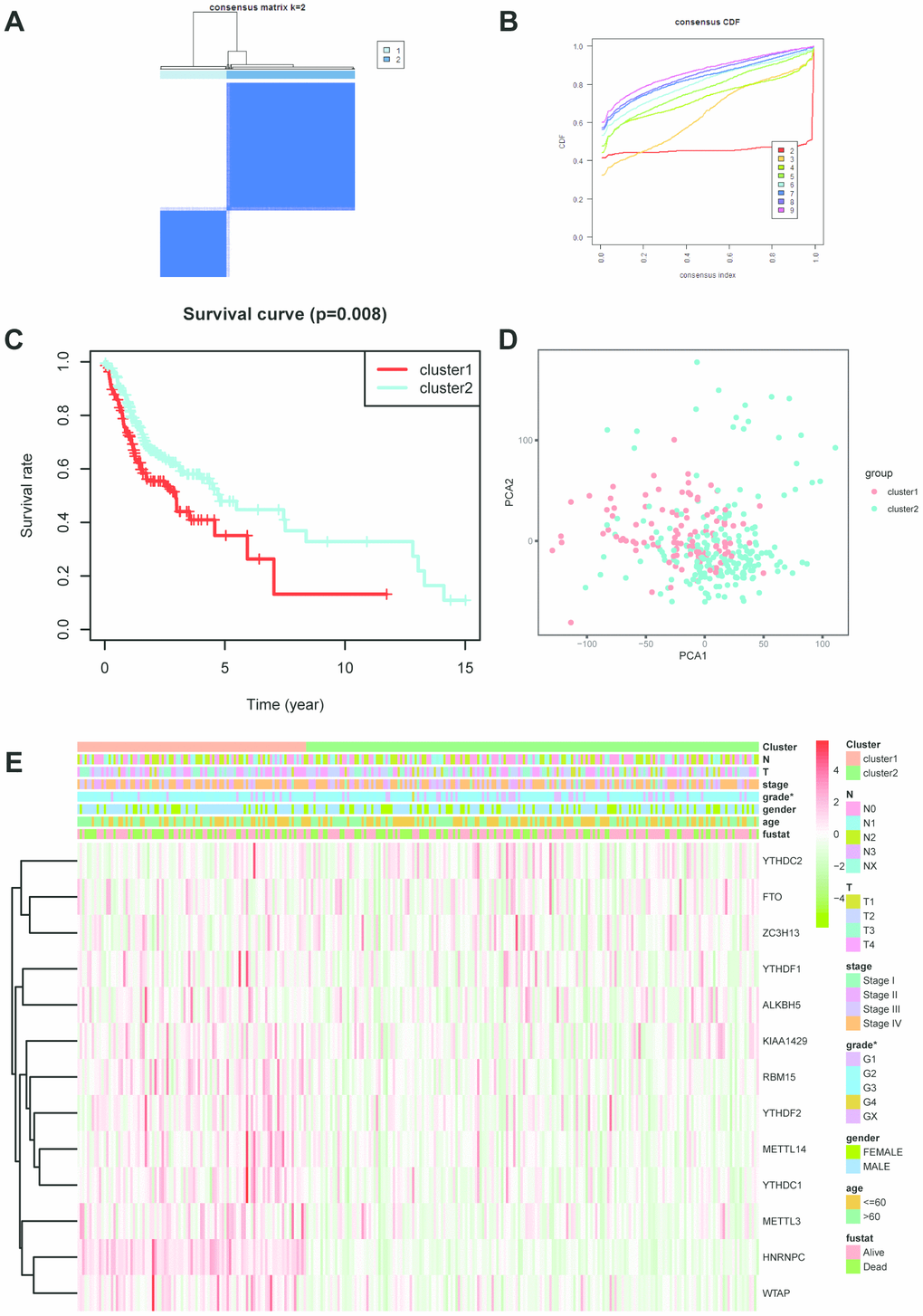 According to the expression profiles of m6A-related genes, cluster analysis was performed to analyze the 317 OSCC samples from the TCGA database, and 2 subtypes were determined (Figure 2A–2C). Subsequently, the result of principal component analysis (PCA) indicates that m6A-related genes can distinguish OSCC patients (Figure 2D). On basis of correlation analysis of clinical characteristics (Figure 2E), the differentiation grade of subtype1 is lower than subtype2 and indicates unfavorable overall survival rate. Unfortunately, there are no correlation between the cluster analysis and other clinical parameters.