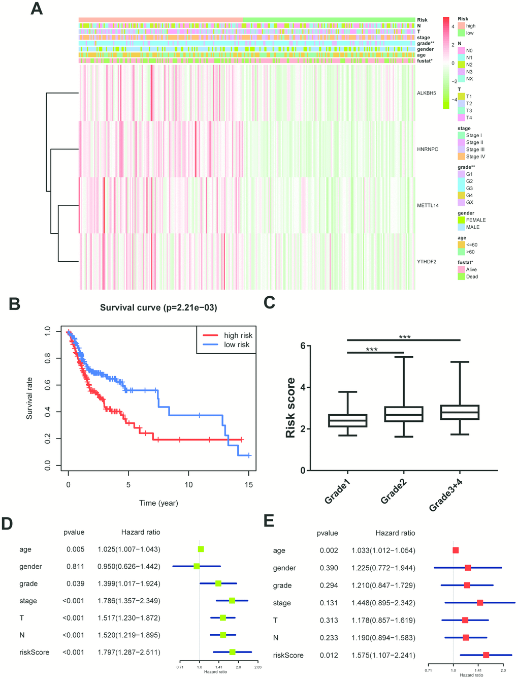 All m6A related genes were enrolled in univariate and multivariate cox regression, and HNRNPC might be an independent biomarker in OSCC (Supplementary Figure 1A, 1B). Furthermore, LASSO cox regression along with 10-fold cross-validation was performed to determine variables. Finally, 4 variables including HNRNPC, METTL14, YTHDF2, ALKBH5 were selected in cox regression (Supplementary Figure 1C, 1D). Risk score =(0.00815*HNRNPC)+(0.0482*METTL14)+(0.0081* YTHDF2)+(0.0086*ALKBH5). And risk score was visualized in R software (Supplementary Figure 1E, 1F). Subsequently, the OSCC patients were divided into high risk and low risk group on basis of median value of risk model (Figure 3A). Survival package in R software was used to analyze the 2 groups. Low risk group tended to experience longer survival time (Figure 3B), and risky genes were higher in high risk group. Correlation analysis between the clinical traits and risk level indicated that high risk group meant lower differentiation grade (Figure 3C). And independent prognostic analysis indicated that risk score may be an independent prognostic biomarker (Figure 3D, 3E).