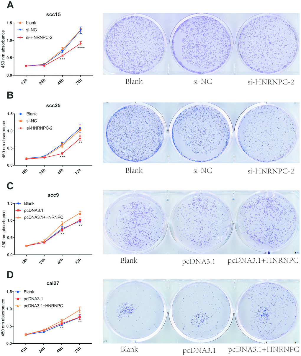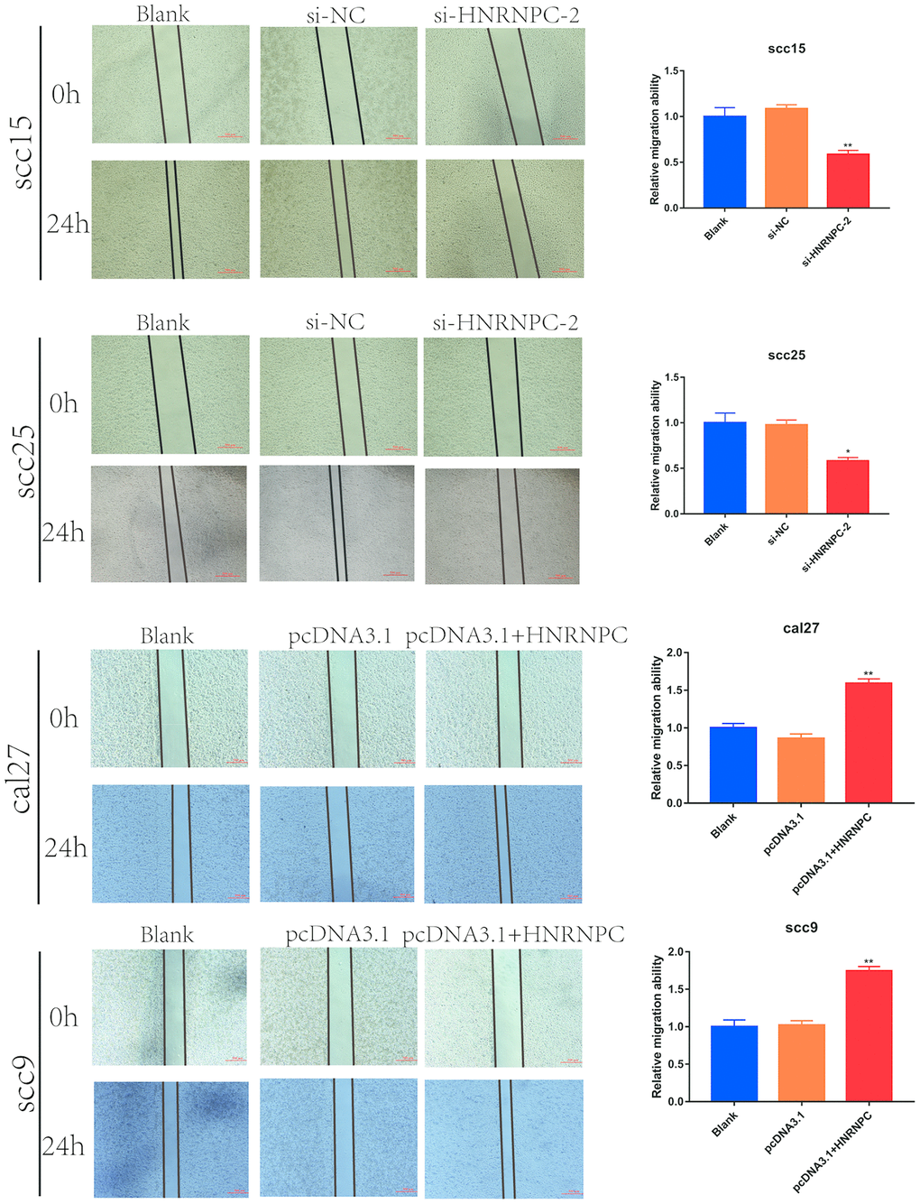 To determine the tumorigenic role of HNRNPC in OSCC, the HNRNPC was silenced with siRNA in scc15 and scc25 cells, and overexpression with pcDNA3.1(pcDNA3.1+ HNRNPC) in scc9 and cal27 cells. And the transfection efficiency of HNRNPC was detected with Western blot assay (Supplementary Figure 3A, 3B). The growth of cells was detected via CCK-8 and colony formation assays. As shown in the results, knockdown of HNRNPC significantly delayed cell proliferation and reduced the clonogenicity in scc15 and scc25 cells (Figure 5A, 5B). Oppositely, upregulation of HNRNPC promoted cell proliferation (Figure 5C, 5D). Furthermore, Transwell assay and scratch wound healing were performed to detect cell migration and invasion ability. Migration and invasion ability of OSCC cells were significantly promoted by the overexpression of HNRNPC and inhibited by the knockdown of HNRNPC in scc15 and cal27 cells (Figure 6A, 6B). The results of migration and invasion ability were similar in scc9 and scc25 cell lines (Supplementary Figure 4A, 4B). Brabletz et al. demonstrated that EMT process played a significant tumorigenic role in cancers [17]. Consequently, EMT process pathway-related markers were detected by western blot (Figure 6C, 6D, Supplementary Figure 4C, 4D). Results showed that overexpression of HNRNPC triggered EMT via enhancement of N-cadherin, MMP9, Vimentin and inhibition of E-cadherin in scc9 and cal27 cells. And it is oppositely in knockdown HNRNPC cells. Furthermore, the results of scratch wound healing assay were consistent with Transwell assay (Figure 7). Statistical analysis was performed in SSPS software (Supplementary Figure 5).