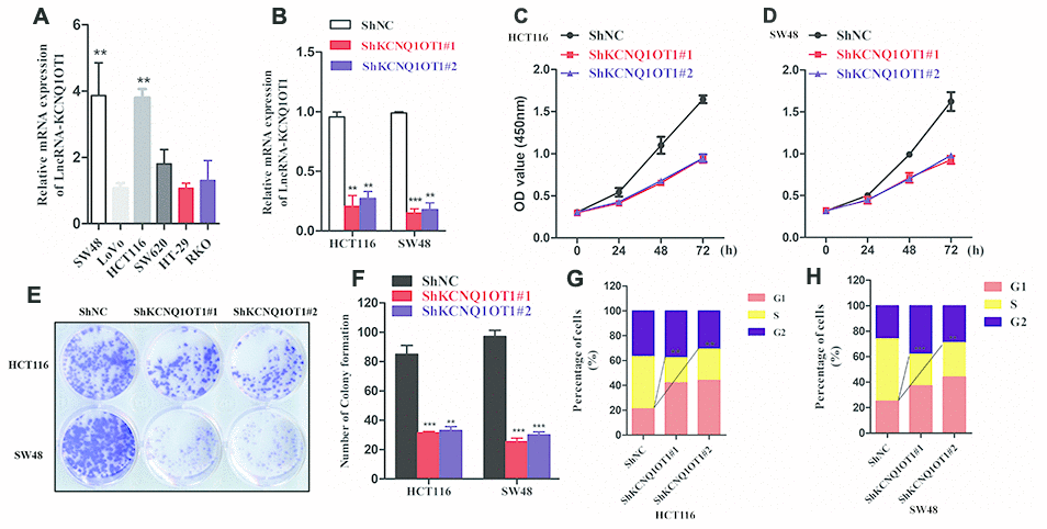 Next, we analyzed KCNQ1OT1 levels in several colorectal cancer cell lines. QRT-PCR analysis showed significantly higher levels of KCNQ1OT1 in HCT116 and SW48 cell lines compared to other colorectal cancer cell lines (Figure 2A). Hence, we selected HCT116 and SW48 cell lines for further experiments. We infected HCT116 and SW48 cells with lentiviruses carrying vectors with sh-NC and sh-KCNQ1OT1 constructs and generated stable control and KCNQ1OT1 knockdown cell lines. QRT-PCR analysis showed that KCNQ1OT1 levels were significantly reduced in KCNQ1OT1 knockdown CRC cell lines compared to controls (Figure 2B). CCK-8 assay results showed that proliferation of KCNQ1OT1-silenced CRC cells was significantly reduced compared to the controls (Figure 2C, 2D). Colony formation assay results showed that the total number of colonies were significantly lower in the KCNQ1OT1-silenced CRC groups compared to the controls (Figure 2E, 2F). Cell cycle analysis showed significantly reduced number of S-phase cells in the KCNQ1OT1-silenced CRC group compared to the controls (Figure 2G, 2H). These data demonstrate that KCNQ1OT1is required for the growth and proliferation of colorectal cancer cells.