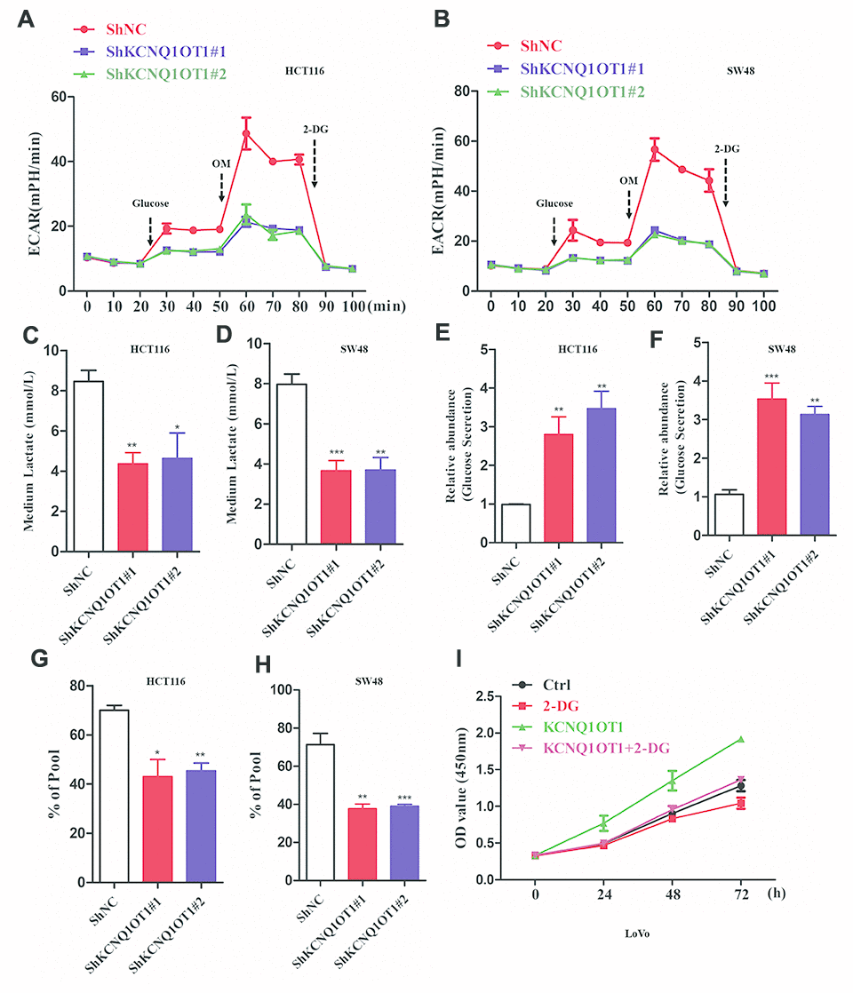 Next, we analyzed whether KCNQ1OT1 regulates aerobic glycolysis in CRC cells. Extracellular acidification rate (ECAR) assay results demonstrated that extracellular acidification was significantly reduced in KCNQ1OT1-knockdown CRC cells compared to the controls (Figure 3A, 3B). Furthermore, lactate levels were significantly reduced in the media of KCNQ1OT1-knockdown CRC cells compared to the media of the controls (Figure 3C, 3D). Moreover, glucose levels were significantly higher in the media of KCNQ1OT1-knockdown CRC cells compared to the controls (Figure 3E, 3F). 13C metabolic flux analysis showed significant reduction 13C-labeled metabolites in the media of KCNQ1OT1-knockdown CRC cells compared to the media of the controls (Figure 3G, 3H). Next, we used a glycolytic inhibitor, 2-deoxyglucose (2-DG), to assess whether KCNQ1OT1 affects CRC cell proliferation by regulating aerobic glycolysis. CCK-8 assays showed that proliferation of KCNQ1OT1-knockdown CRC cells was suppressed by treatment with 2-DG (Figure 3I). These data suggest that KCNQ1OT1 promotes CRC cell proliferation and growth by enhancing aerobic glycolysis.