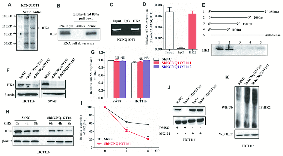 Next, we analyzed HK2 mRNA and protein levels in KCNQ1OT1-knockdown CRC cells. The HK2 protein levels were significantly reduced in KCNQ1OT1-knockdown CRC cells compared to the controls (Figure 4F). However, HK2 mRNA levels were similar in control and KCNQ1OT1-knockdown CRC cells (Figure 4G). These data suggest that KCNQ1OT1 regulates HK2 protein expression at the post-transcriptional level. We further treated control and KCNQ1OT1-knockdown CRC cells with a protein synthesis inhibitor, cycloheximide (CHX) to assess the stability of HK2. The results showed that HK2 degradation increased significantly in the KCNQ1OT1-knockdown CRC cells compared to the controls (Figure 4H, 4I). This suggests that KCNQ1OT1 regulates HK2 protein degradation through the ubiquitin-proteasome pathway. The control and KCNQ1OT1-knockdown CRC cells treated with the proteasome inhibitor, MG132, showed similar HK2 protein levels as analyzed by western blotting (Figure 4J). Furthermore, we examined the status of HK2 ubiquitination in control and KCNQ1OT1-knockdown CRC cells. Western blot results showed that the levels of ubiquitinated HK2 protein were significantly higher in the KCNQ1OT1-knockdown CRC cells compared to the controls (Figure 4K). Collectively, these data suggest that direct interaction between KCNQ1OT1 and HK2 inhibits ubiquitination of HK2 and its subsequent degradation through the proteosomal pathway, thereby enhancing its stability.