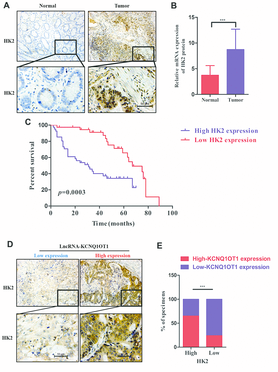 We next examined HK2 levels in colorectal tumor and adjacent normal colorectal tissues in 79 CRC patients. Immunohistochemical staining results show that HK2 expression is significantly higher in CRC tissues compared to the adjacent normal colorectal tissues (Figure 6A). QRT-PCR results also show that HK2 mRNA levels are significantly higher in CRC samples compared to normal tissues (Figure 6B). Kaplan Meier survival curve analysis shows worse prognosis for CRC patients with high HK2 expression compared to those with low HK2 expression (Figure 6C). Furthermore, KCNQ1OT1 levels (qRT-PCR) positively correlate with HK2 protein expression (IHC data) in CRC patients (Figure 6D, 6E). In conclusion, our data shows that KCNQ1OT1 regulates colorectal carcinogenesis by upregualting aerobic glycolysis via HK2.