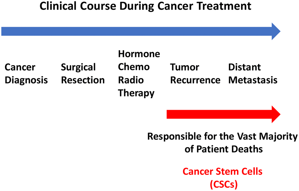 After a breast cancer diagnosis, most patients undergo surgical resection of the primary tumor and are then subsequently treated with hormone-, chemo- and/or radio-therapy, depending on the breast cancer subtype. However, many patients ultimately experience treatment failure, resulting in tumor recurrence and distant metastasis. Unfortunately, distant metastasis is responsible for the premature deaths in the vast majority of cancer patients, approaching >90% (Figure 1). Therefore, new diagnostics and therapeutics are urgently needed to prevent and treat metastatic disease, which has been attributed to the existence and resurgence of a small sub-population of cancer cells, known as cancer stem cells (CSCs).