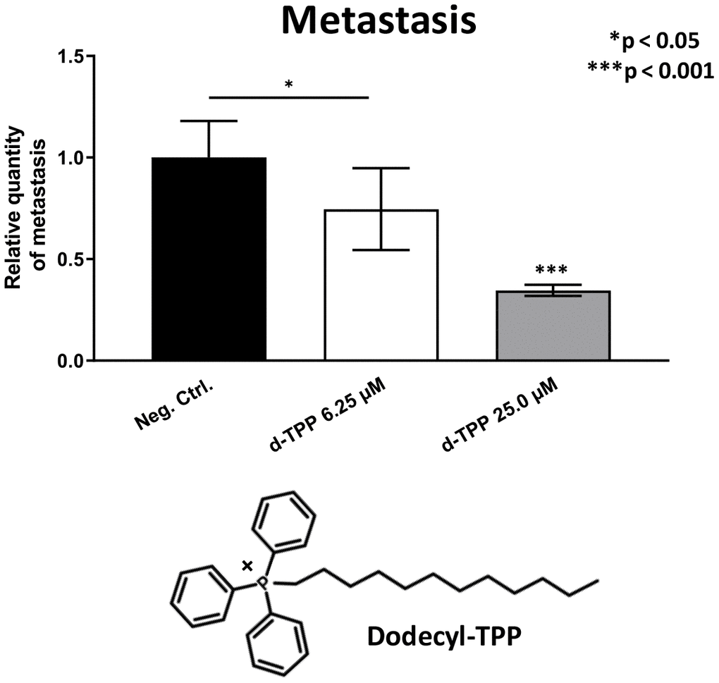 Here, we now show that the Mitoriboscins have only minor effects (23/G4) or no inhibitory effects (24/D4, 24/F9) on tumor growth, but functionally prevent metastatic progression. Quantitatively similar results were obtained with another independent class of mitochondrial inhibitors, namely Butene-1,4-bis-triphenyl-phosphonium (Bis-TPP) and Dodecyl-triphenyl-phosphonium (Dodecyl-TPP) [16, 17]. Bis-TPP and Dodecyl-TPP both contain a TPP moiety, which functions as a chemical signal for mitochondrial targeting [16, 17]. These data provide in vivo functional evidence that five mitochondrial inhibitors can successfully and preferentially target the biological process of cancer cell metastasis, without significant toxicity.