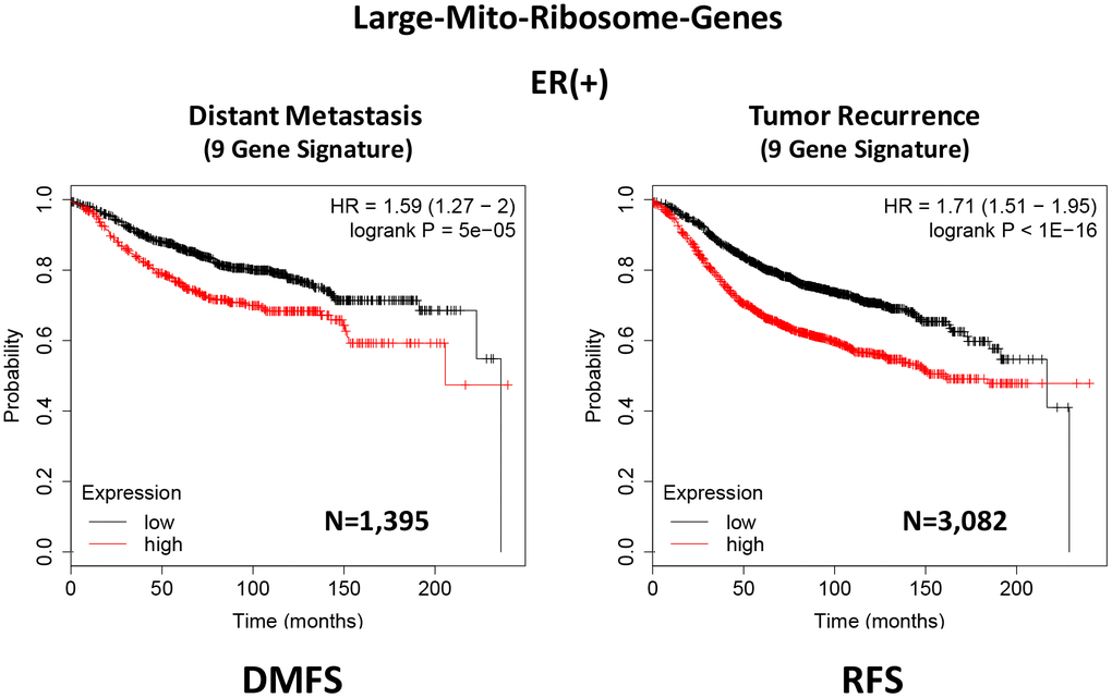 Since the Mitoriboscins were originally engineered to inhibit the large mitochondrial ribosome [15], we also focused on whether the large mitochondrial ribosomal gene transcripts (MRPL) have any prognostic value, for predicting distant metastasis in ER(+) breast cancer patients. Importantly, signatures containing MRPL gene transcripts were effective in predicting metastasis, recurrence and Tamoxifen-resistance. Similar results were also obtained in ER(-) breast cancer patients. As a consequence of the success of this approach, these MRPL gene signatures may ultimately be useful as new companion diagnostics, to guide decisions to determine which patients would benefit from anti-mito-ribosome therapy.