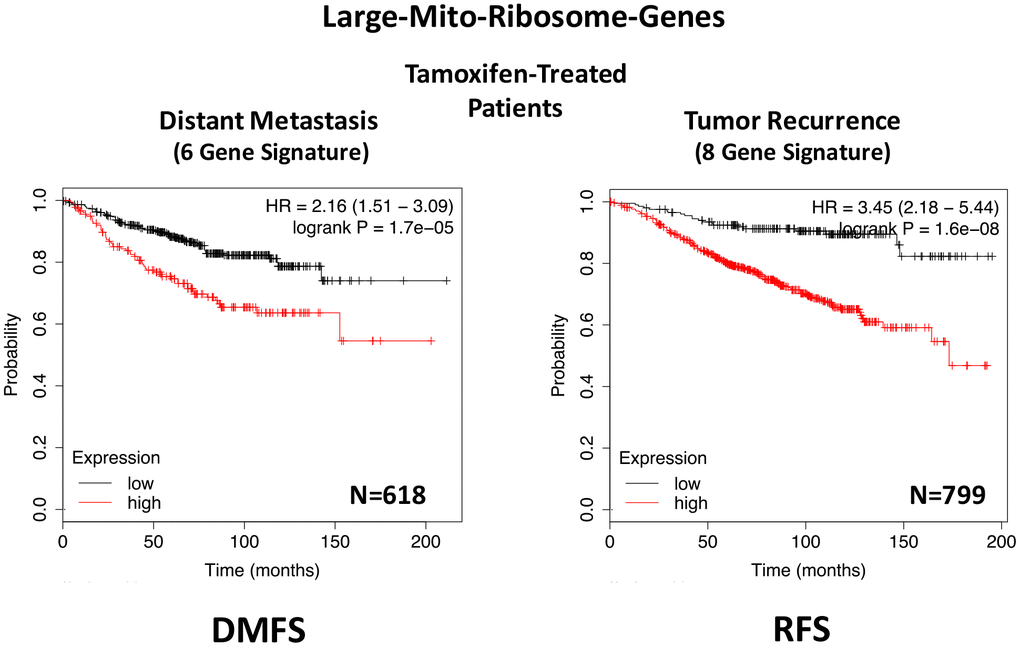 In ER(+) breast cancer, a 9-gene mito-ribosome signature was able to effectively predict distant metastasis in N=1,395 patients (HR=1.59; P=5e-05) and tumor recurrence in N=3,082 patients (HR=1.71; P<1e-16) (See Supplementary Tables 4 and 5; Figure 11). Importantly, a closely related mito-ribosome signature was also able to predict treatment failure in a sub-set of ER(+) patients undergoing Tamoxifen treatment, which resulted in distant metastasis (N=618 patients; HR=2.16; P=1.7e-05) and tumor recurrence (N=799 patients; HR=3.45; P=1.6e-08) (Supplementary Tables 6 and 7; Figure 12).