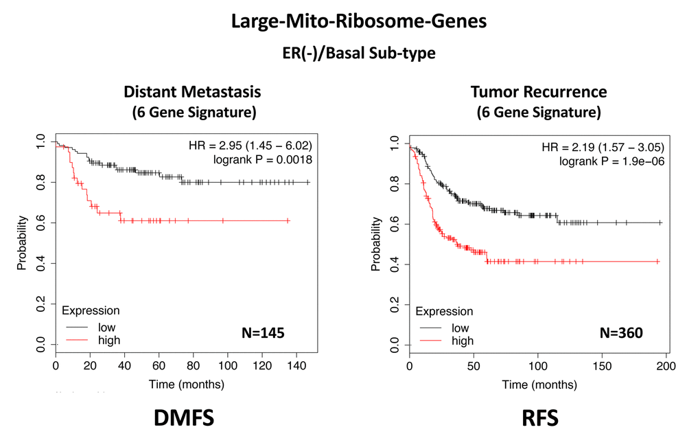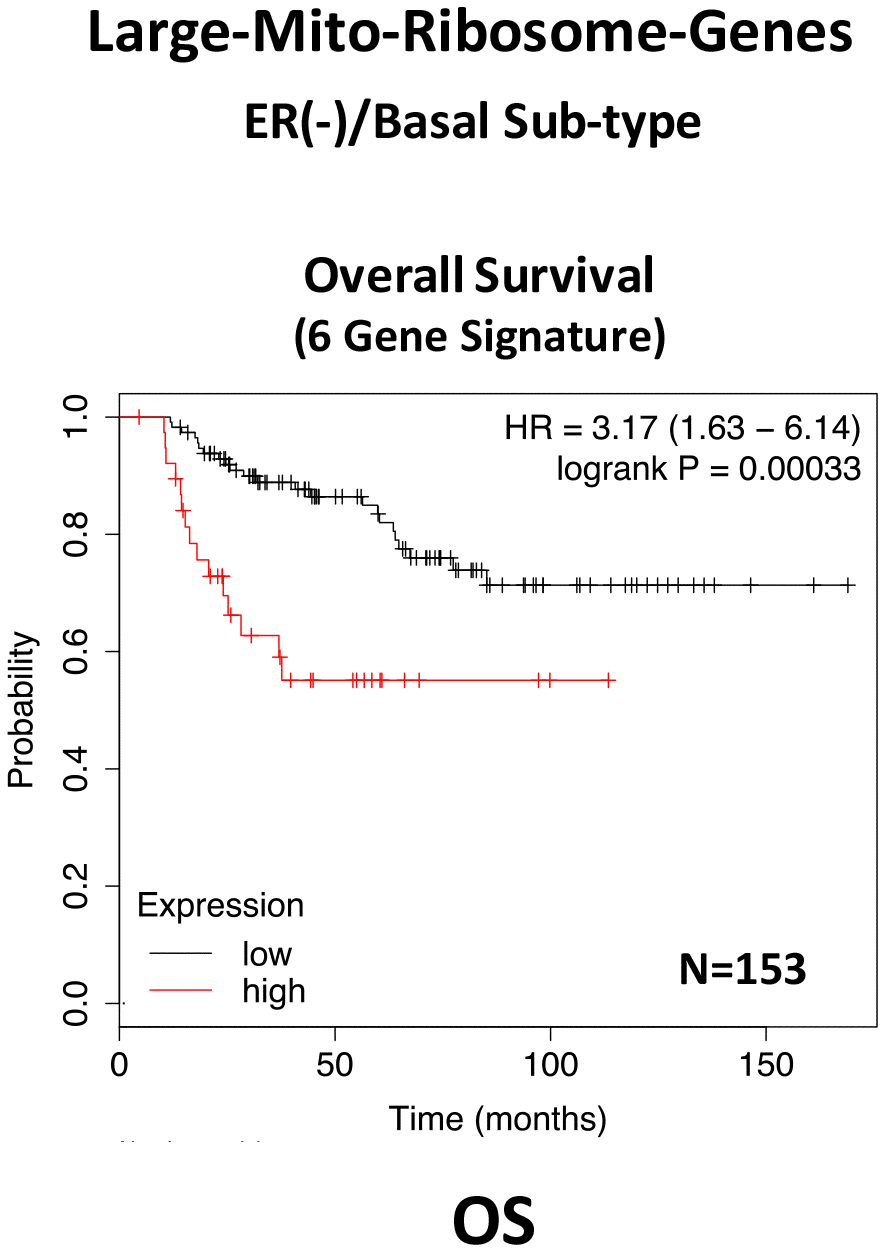 In ER(-)/basal breast cancer, a distinct 6-gene mito-ribosome MRPL signature was also able to effectively predict distant metastasis in N=145 patients (HR=2.95; P=0.0018) and tumor recurrence in N=360 patients (HR=2.19; P=1.9e-06), as well as overall survival in N=153 patients (HR=3.17; P=0.00033) (Supplementary Table 8; Figures 13 and 14).