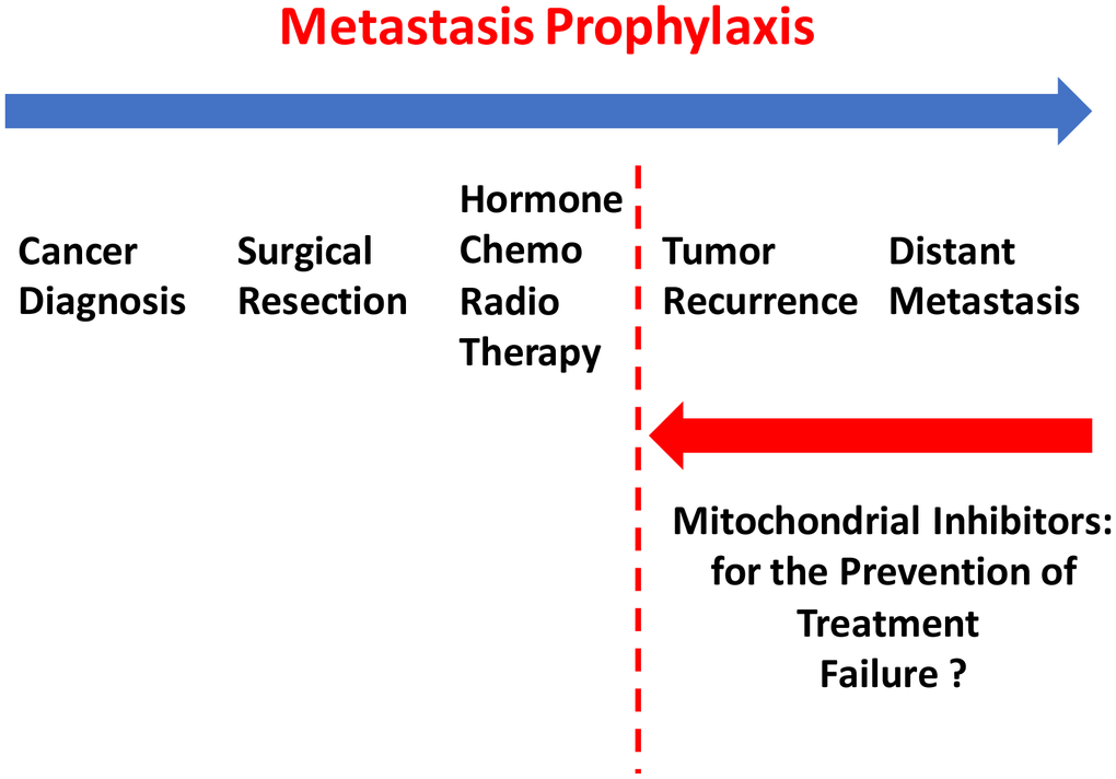 To further test this hypothesis experimentally, we next employed a well-established animal model, namely the chorio-allantoic membrane (CAM) in chicken eggs, to test a series of mitochondrial inhibitors. These mitochondrial inhibitors, including the Mitoriboscins, have been previously described to effectively inhibit 3D-mammosphere formation in MCF7 cells and cell migration in MDA-MB-231 cells. All five of these mitochondrial inhibitors selectively prevented MDA-MB-231 tumor cell metastasis, but had only minor effects or no effect on tumor formation. More specifically, we have previously shown that these mitochondrial inhibitors successfully induce ATP-depletion in cancer cells, by targeting mitochondrial protein translation and/or OXPHOS activity [15–17]. Our current studies provide the necessary in vivo functional evidence, that mitochondrial inhibitors can successfully prevent cancer metastasis. These findings could have important clinical implications, for ultimately preventing treatment failure in breast cancer patients, via metastasis prophylaxis (Figure 15).