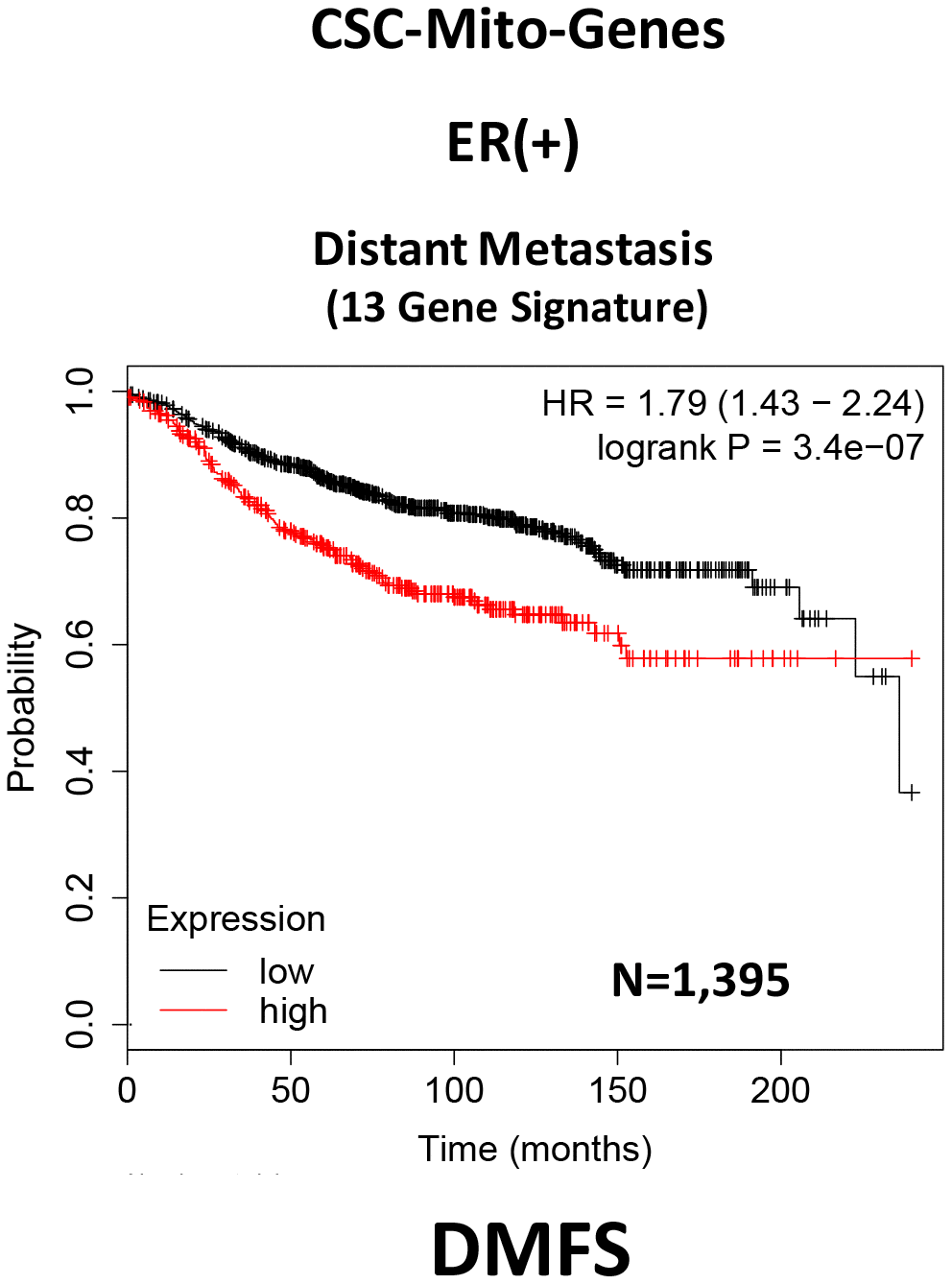 Here, we interrogated whether the mRNA transcripts of these mitochondrial proteins show any prognostic value in large numbers of ER(+) human breast cancer patients. Interestingly, we observed that 13 of these 25 gene transcripts showed prognostic value in predicting distant metastasis. We then used these 13 gene transcripts to create a mitochondrial-related gene signature, that effectively predicted distant metastasis in 1,395 patients (HR=1.79; P=3.4e-07). See Supplementary Table 1 and Figure 2.