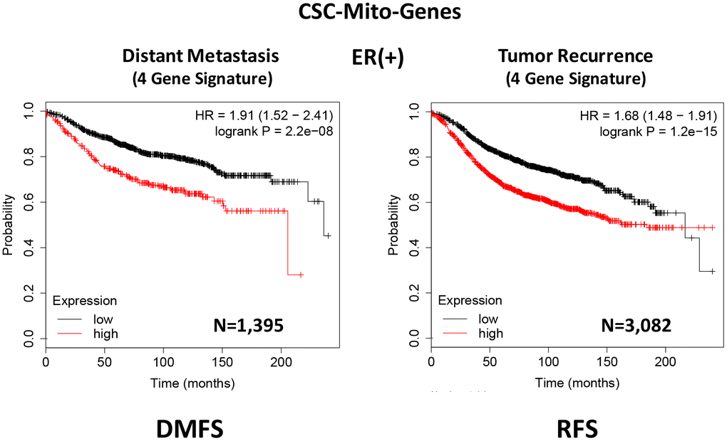 Current thinking indicates that CSCs are the etiological cause of treatment failure in most cancer patients, as they are the cellular drivers of tumor recurrence, metastasis and drug-resistance [1–5]. As a consequence, new therapeutic approaches are needed to effectively eliminate CSCs. Our previous studies identified CSC mitochondria as a potential new therapeutic target. More specifically, we experimentally observed that MCF7-derived 3D-mammospheres are specifically enriched in mitochondrial proteins; 25 mitochondrial proteins showed greater than 100-fold over-expression, while 9 of these proteins were infinitely up-regulated, as compared with 2D-monolayers [6]. In this report, we used these proteomic data as possible candidates to generate short mitochondrial gene signatures that could be employed as prognostic tools to predict distant metastasis (in N=1,395 patients) and tumor recurrence (in N=3,082 patients), in a large collection of ER(+) breast cancer patients. For example, we developed a 4-gene signature for predicting distant metastasis, resulting in a hazard ratio of 1.91-fold (P=2.2e-08). This clinical evidence supports the idea that CSC mitochondria may play a critical functional role in the metastatic dissemination of cancer cells.