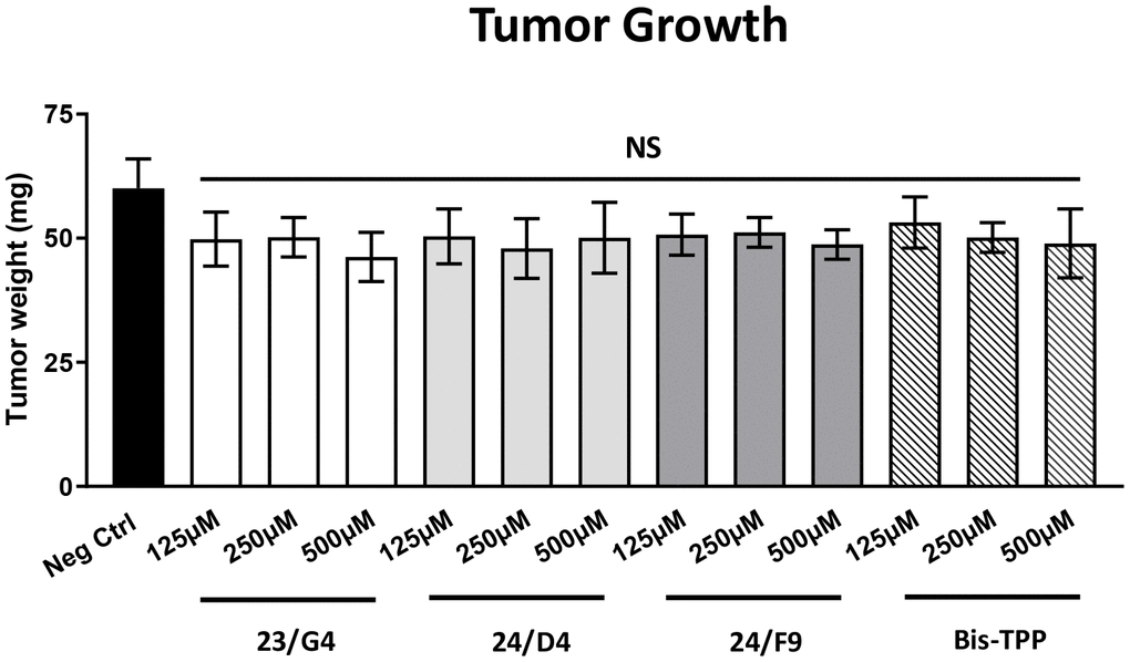 Figure 5 shows the effects of the three Mitoriboscins (23/G4, 24/D4, 24/F9) and Bis-TPP on MDA-MB-231 tumor growth. Note that none of the four inhibitors tested showed any significant effects on tumor growth, as a result of the 8-day period of drug administration.