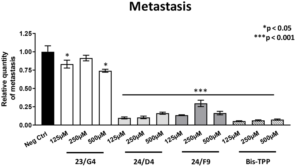 However, all four mitochondrial inhibitors showed significant effects on MDA-MB-231 cancer cell metastasis. Figure 6 illustrates that all three Mitoriboscins were clearly effective in inhibiting metastatic progression, although 24/D4 and 24/F9 were the most effective. In addition, Bis-TPP also significantly prevented metastasis.
