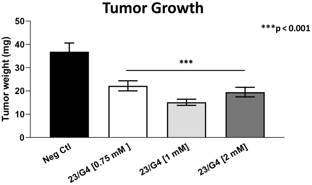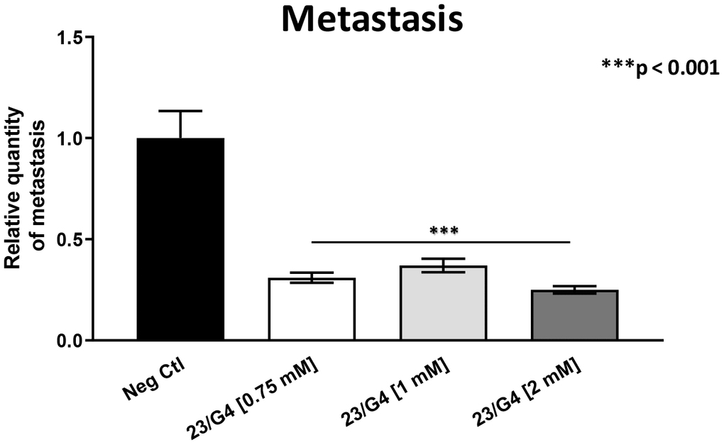 As 23/G4 was minimally effective at a concentration of 0.5 mM, we also tested it at higher concentrations of 0.75, 1 and 2 mM. Importantly, our results show that 23/G4, at these concentrations, significantly inhibited both tumor growth (by 40% to 60%; Figure 7) and metastatic progression (by 70-75%; Figure 8). Interestingly, as expected, the effects of 23/G4 on metastasis were significantly more pronounced.