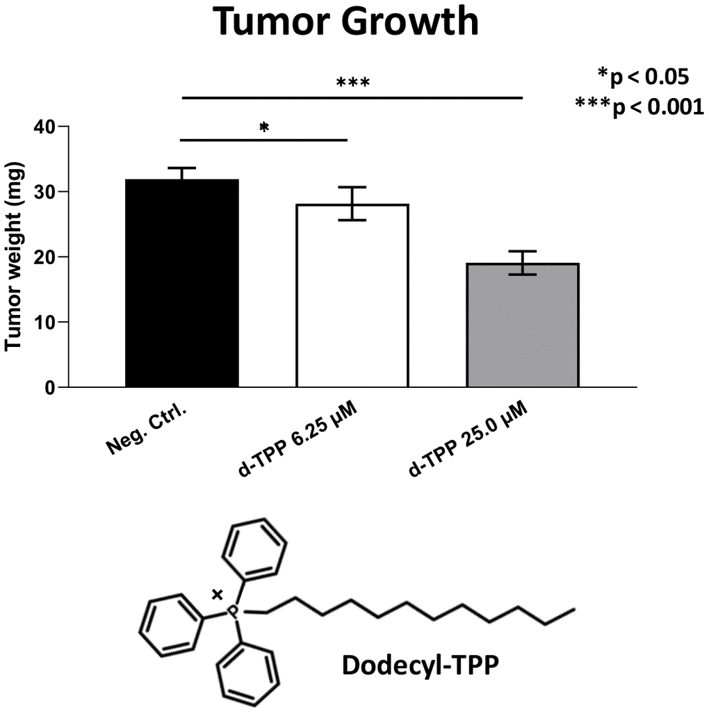 Finally, we also tested another more potent mitochondrially-targeted TPP compound, namely Dodecyl-TPP, using low micro-molar concentrations (6.25- and 25-μM). Figures 9 and 10 demonstrate that Dodecyl-TPP significantly inhibited tumor growth (by 12% to 40%; Figure 9) and metastatic progression (by 25 to 65%; Figure 10). As predicted, Dodecyl-TPP preferentially targeted metastasis, rather than tumor growth. It is worth noting that Dodecyl-TPP showed some toxicity, but only at 62.5-μM, preventing reliable analysis of its effects on tumor growth and metastasis, at this higher concentration (Table 3). However, Dodecyl-TPP showed little or no toxicity at 6.25- and 25-μM (Table 3).