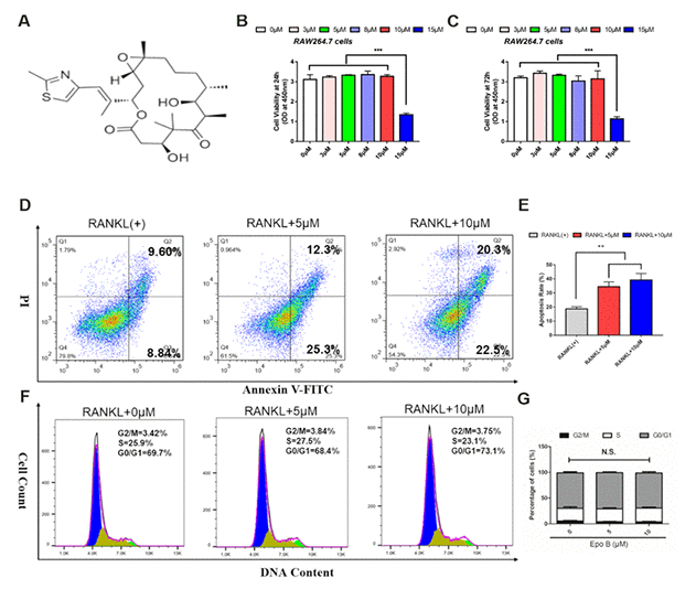 Epothilone B (Epo B) was an antineoplastic agent that was known to induce α-tubulin polymerization and enhance microtubule stability [14]. Administration of Epo B has been widely investigated for its neuroprotective effects via anti-inflammatory activity and inhibitory effect on fibrotic scarring after spinal cord injury by increasing fibroblasts apoptosis [15]. In particular, Epo B also showed protective effect in Parkinson’s disease through mediating microglial polarization via down-regulating the inflammatory stimulation [16]. However, the effects of Epo B on bone lytic diseases and osteoclast activity have not been reported.