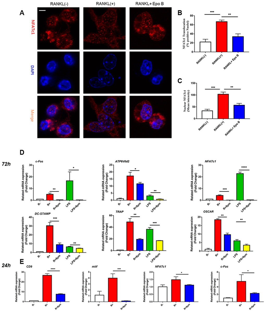 To detect the effect of Epo B on RANKL and LPS induced osteoclast differentiation, osteoclast specific TRAP staining was performed. Based on the cytotoxicity analysis of Epo B, 5 μM and 10 μM of Epo B were chosen to perform this staining. TRAP-positive (red) cells with more than three nuclei were counted as osteoclasts. Quantitative analysis of the results revealed that treatment with RANKL alone could dramatically promote osteoclastogenesis (Figure 2B–2E). Interestingly, RANKL-stimulated activation of osteoclastogenesis was dramatically reversed in the presence of 5 μM Epo B. After treatment with Epo B at 10 μM, mature osteoclasts with more than three nuclei were not found. Coincidently, LPS has been reported many times to play an essential role in inducing osteoclast differentiation. Treatment with LPS (100 ng/ml) alone for 72 h could not induce the mature osteoclasts. However, pre-treatment with RANKL (100 ng/ml) and M-CSF (50 ng/ml) for 24 h and then treatment with LPS for another 48h resulted in the activated multinucleated mature osteoclasts. When Epo B was added to the incubation system, osteoclast differentiation and TRAP activity were also dramatically abrogated (Figure 2B). In accordance, changes in mature osteoclast differentiation specific genes at the mRNA level were also detected. c-Fos, NFATc1, TRAP, DC-STAMP, ATP6V0d2 and OSCAR were significantly suppressed by Epo B treatment during RANKL and LPS induced osteoclastogenesis, which were consistent with the TRAP staining results (Figure 4D). Moreover, Epo B also regulated the expression of genes in the early stage of osteoclast differentiation from monocytes to preosteoclasts such as CD9, mitf, c-Fos and NFATc1 (Figure 4E).