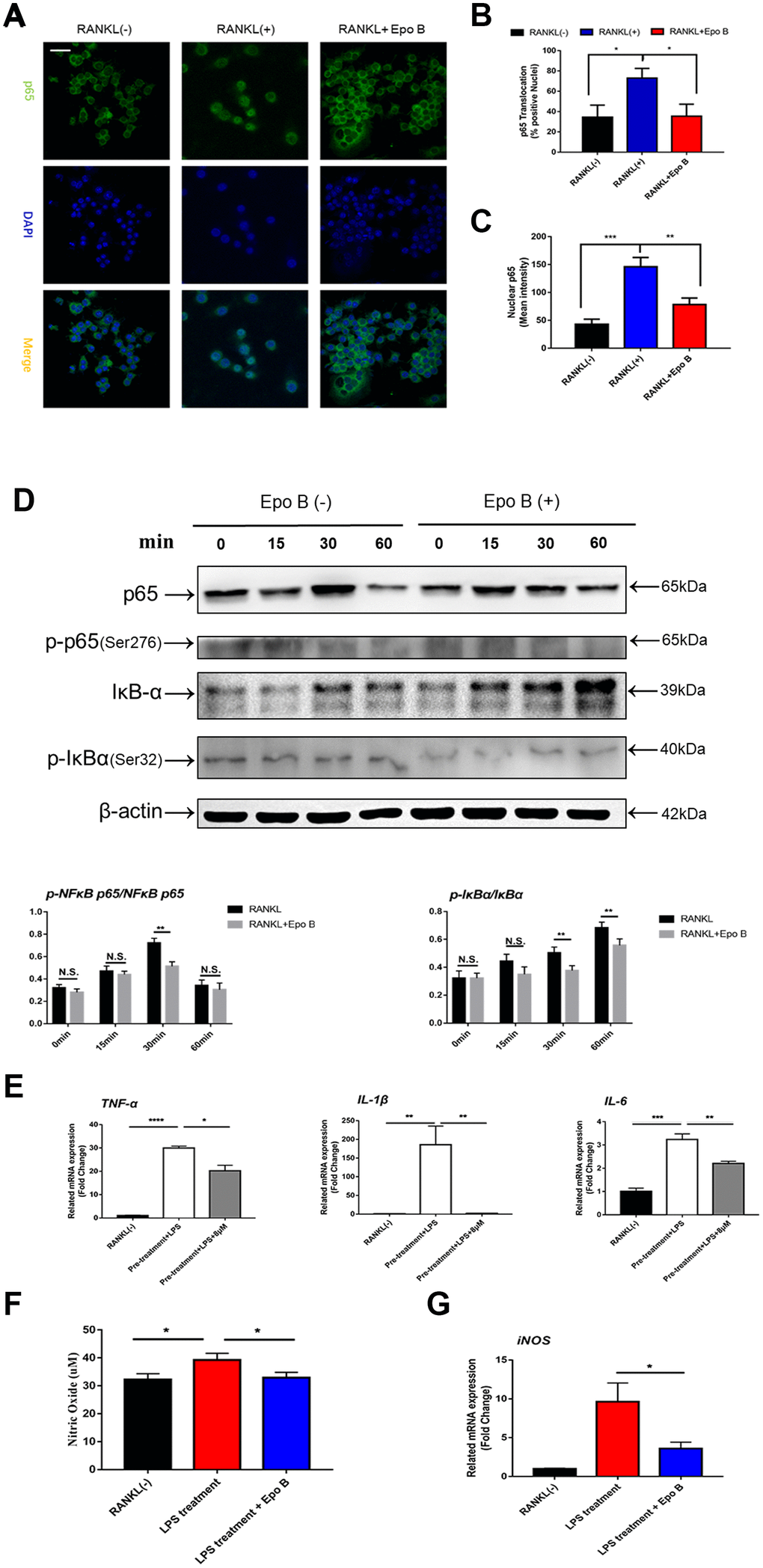 Due to the excellent anti-osteoclastic effect of Epo B during osteoclastogenesis, the potential mechanism was detected. RANKL stimulated NF-κB signaling pathway was an essential step in osteoclast differentiation. After stimulating RAW264.7 cells with RANKL could significantly enhance NF-κB p65 activity, the phosphorylation of NF-κB p65, the phosphorylation and degradation of IκB when treated for 60 min (Figure 5D). However, these effects were significantly reversed after co-culturing with Epo B. To determine whether the nuclear translocation of NF-κB p65 was influenced by Epo B, immunofluorescence analysis was performed. Treatment with only RANKL dramatically enhanced the nuclear translocation of NF-κB p65. In addition, the mean intensity of NF-κB p65 in the nuclei and the number of cells with positive nuclear translocation were robustly suppressed by treatment with Epo B (Figure 5A–5C). Together, these results indicated that Epo B attenuated RANKL induced osteoclastogenesis through regulating NF-κB signaling pathway.