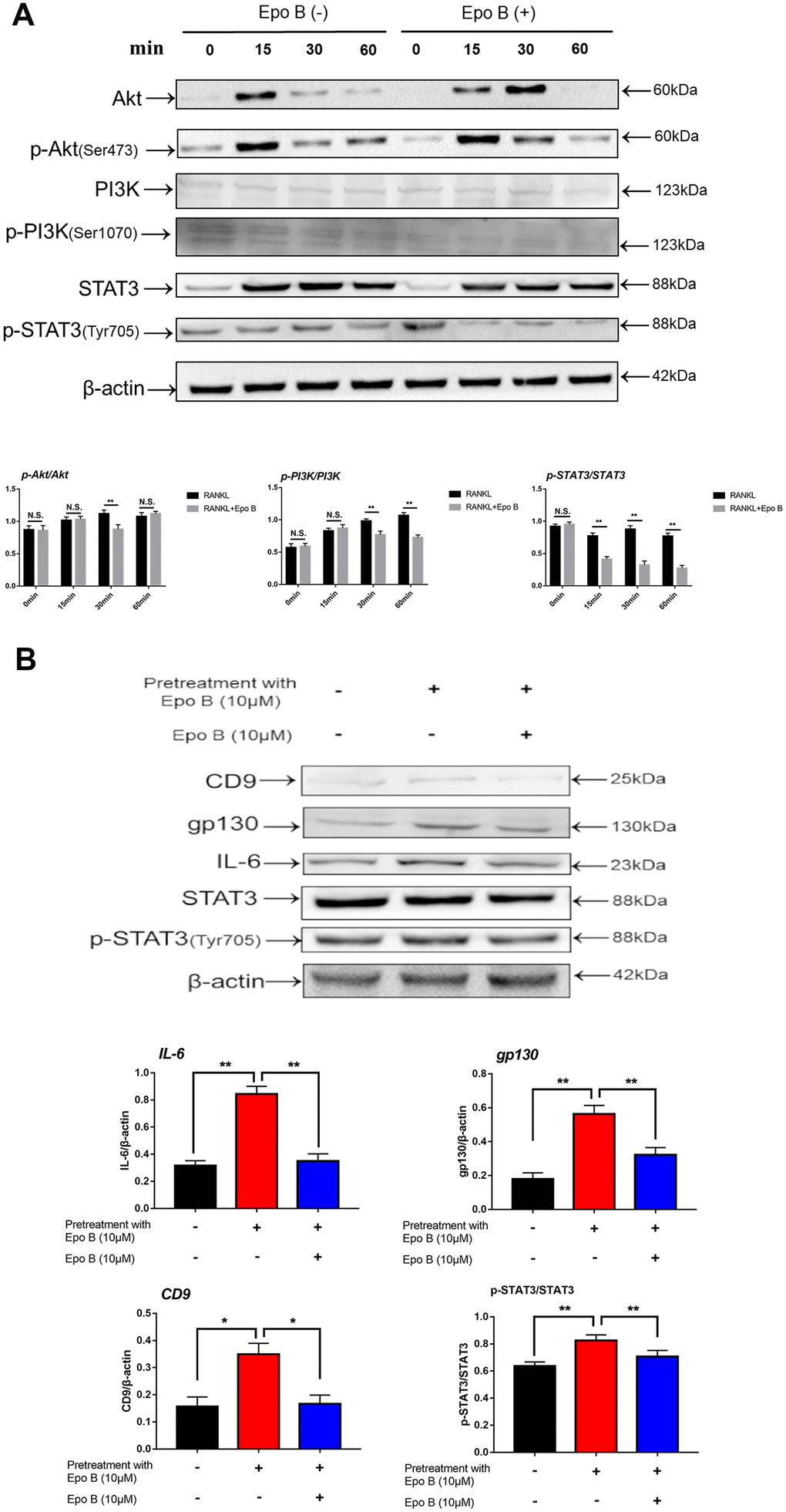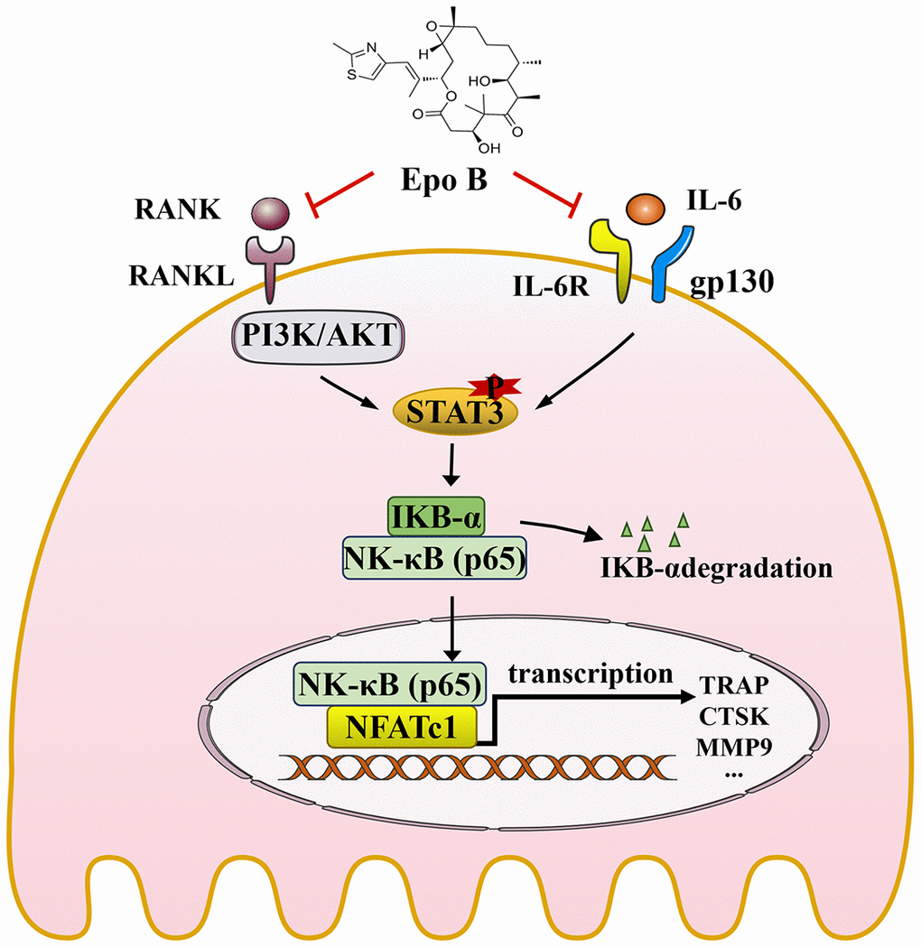 In summary, our study demonstrated that Epo B suppressed osteoclastogenesis and osteoclast bone resorption activity in vitro and LPS-induced inflammatory bone destruction in vivo. We also confirmed that the underlying mechanism of this inhibitory effect was direct suppression of the PI3K/Akt/STAT3 pathway or indirect suppression of the CD9/gp130/STAT3 pathway, thereby mediating nuclear translocation of NF-κB p65 to downregulate the master genes such as c-Fos and NFATc1 so as to regulate osteoclast differentiation and fusion. These results indicated that Epo B was a potential therapeutic agent that protected against inflammatory excessive osteoclast-related diseases such as chronic implant-related bone infections, osteomyelitis, periprosthetic infection and other inflammatory osteolysis.