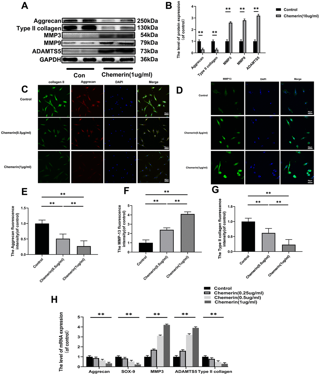 Exploration the role of chemerin (1 μg/ml, for 24 hours) in disrupting the ECM synthesis and degradation. The results of western blotting show that chemerin significantly reduce the expression levels of collagen II, aggrecan, and SOX9, which were important for the ECM synthesis, but promote the MMP9, MMP13, and ADAMTS5 production, which were regarded as main matrix degrading protein (Figure 3A, 3B). In addition, the results of cell immunofluorescence showed that collagen II, aggrecan, and MMP13 were in the nucleus and cytoplasm. After chemerin (0.5, and 1 μg/ml for 12 hours) treatment, the abundance of collagen II, and aggrecan cell fluorescence were significantly decreased with increasing chemerin concentration (Figure 3C–3G). To further confirm the injury action of chemerin, the mRNA expression of related genes was assessed (Figure 3H). So, the results showed that chemerin promoted the expression levels of MMP3, ADAMTS5, and MMP9 but inhibited the expression levels of collagen II, SOX-9, and aggrecan. We also detected whether chemerin could significantly impact the AF cells. The results of immunofluorescence and western blotting showed that chemerin can influence matrix metabolism of AF, which is the same as NPCs (Supplementary Figure 1). In conclusion, the above results suggest that chemerin can significantly inhibit ECM synthesis, promote matrix degradation protein synthesis, and finally disrupt the balance of ECM synthesis and degradation.