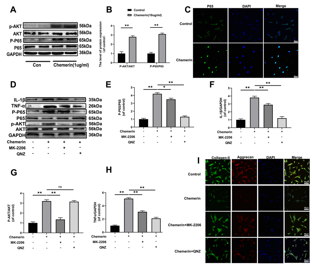 In our study, in order to know the role of chemerin in inducing inflammation, cell senescence, and matrix degradation, different concentrations of chemerin (0, 0.5, 1μm/ml) were added in medium culturing for NPCs for 24 hours. To confirm that chemerin induces inflammation through the NF-kB and AKT signaling pathway, we used QNZ, an inhibitor suppressing effect of NF-kB mediated-inflammatory responses, and MK2260, an effective oral AKT allosteric inhibitor to perform the in vitro study.