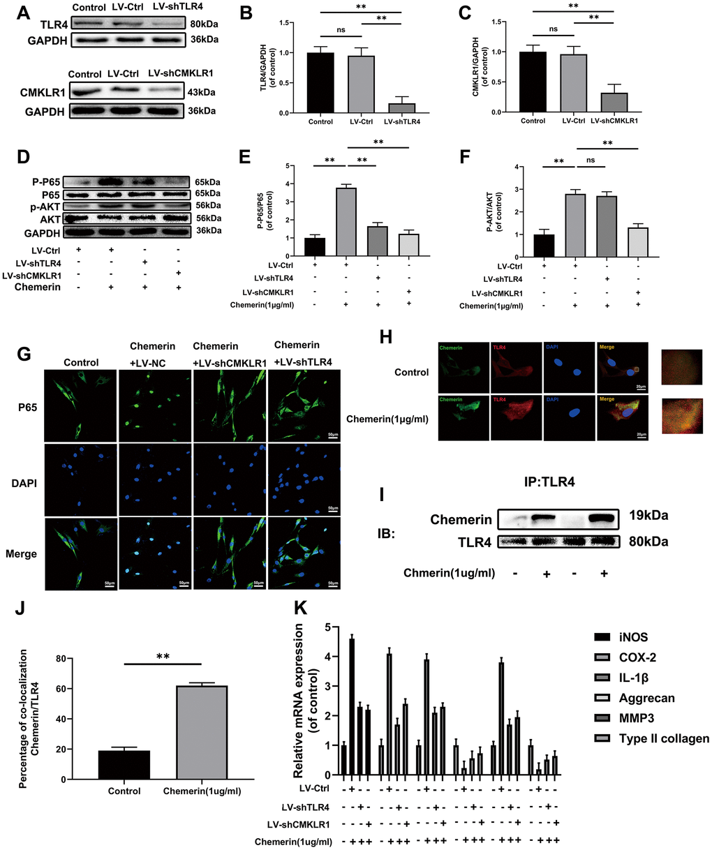 To further explore the mechanism of chemerin inducing the activation of NF-kB pathway, TLR4 and CMKLR1 knockdown lenti-Virus were used to downregualte the protein expression. (Figure 5A–5C) showed that lentivirus reduced the expression levels of TLR4, and CMKLR1 precisely, indicating that there were no off-target effects. Activation of NF-kB signaling pathway induced by chemerin was reversed after using of Lv-shTLR4, and Lv-shCMKLR1 reduced AKT phosphorylation while Lv-shTLR4 did not, suggesting that TLR4 and CMKLR1 were in two different signaling pathways (Figure 5D–5F). Moreover, Lv-shTLR4, and Lv-shCMKLR1 could significantly suppressed the upregulated NF-kB nuclear translocation (Figure 5G). Besides, to confirm chemerin binding to TLR4, we performed co-ip, and immunofluorescence to co-location. Compared to the control group, chemerin binding to TLR4 was significantly increased by chemerin (1 μg/ml, 24 hours) treatment (Figure 5H–5J). The treatment of Lv-shTLR4 and Lv-shCMKLR1 markedly reversed the mRNA up-regulation of iNOS, COX-2, IL-1β and MMP3 also down-regulation of aggrecan, and collagen II induced by chemerin (1 μg/ml, 6 hours) (Figure 5K).