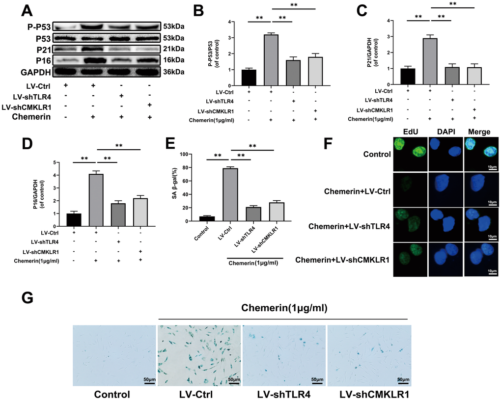 Aging is the main factor affecting the activity of NPCs. The protein expression of senescence-related makers, such as p53, and p16 were assessed by western blotting. The results show that p-p53, and p16 were markedly increased during chemerin stimulation, and reduced by Lv-shTLR4 and Lv-shCMKLR1 (Figure 6A–6D). In order to study whether chemerin promotes cell senescence, SA-β gal staining, a classical method was used to detect the cell senescence. Lv-shTLR4, and Lv-shCMKLR1 reduced the number of SA-β-gal positive cells in the chemerin-treated NPCs (Figure 6E, 6G). EdU assay, a method is widely used to detect the cell proliferation, which is decreased in senescent cell (Figure 6F). We found that chemerin could impair the proliferation capacity of NPCs, Lenti-shTLR4, and Lenti-shCMKLR1.