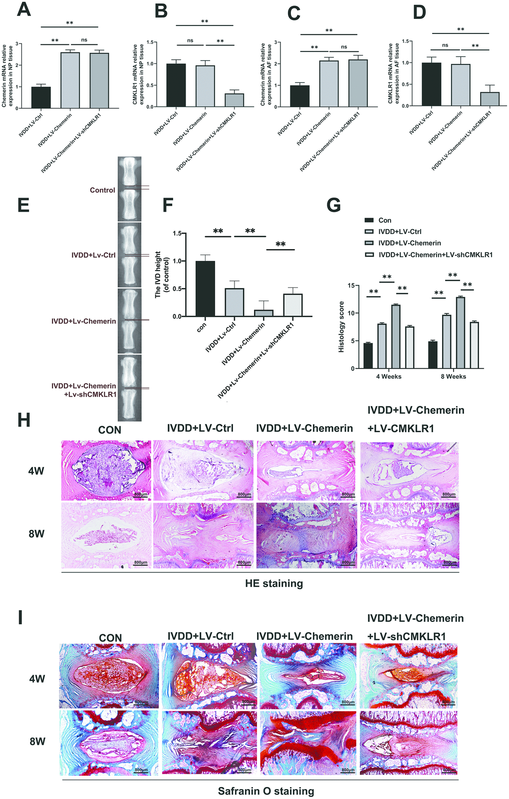 Whole IVDs, including NP and AF were gently obtained from rats (male, 150–200 g, 8 week old), then left overnight before being randomized to three groups: (A) IVD; (B) IVD + chemerin; (C) IVD + chemerin + LV-TLR4; (D) IVD + chemerin + LV-CMKLR1 were given for 4 weeks after the photos were showed morphology changes, and safranin O fast green for proteoglycans and matrix degeneration. Caudal discs were isolated and cultured as previously described [55]. Caudal discs with complete endplates were isolated and cultured in DMEM containing 15% fetal bovine serum and 1% penicillin/streptomycin (Thermo Fisher Scientific, Waltham, MA).