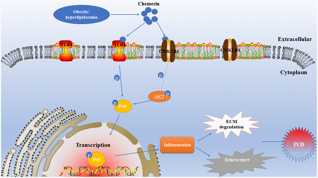 NF-kB plays major roles to regulate in the expression of IL-1β, IL-6, TNF-α, MMPs, and other inflammatory factors. The release of inflammatory cytokines and MMPs further damage the disc's structural proteins, such as proteoglycan, and collagen II. According to our results, chemerin activates the NF-kB signaling pathway through binding to the TLR4 receptor. In addition, chemerin binds to its own receptor CMKLR1 to phosphorylate AKT, and phosphorylated AKT further activates the NF-kb signaling pathway. In other words, chemerin activates the NF-kB signaling pathway together through two signal transduction pathways to trigger inflammatory responses (Figure 8). Prior studies have confirmed that chemerin plays significant roles in lipid, and glucose metabolism. To explore the effects of chemerin, and its receptor in IVDD model, we injected lentivirus into the rat’s intervertebral disc to knockdown the CMKLR1, and overexpress chemerin (Figure 7), then we performed X-ray, HE, and SO staining to estimate imageology and histomorphology changes. The results showed that the histomorphological, and immunological changes of rats injected with lentivirus to upregulate. Chemerin were worse than those treated with annulus needle puncture. However, these changes can be reversed to some extent by CMLKR1 knockdown. Hyperlipidemia, high total cholesterol, and high triglycerides are usually associated with high chemerin level, which is consistent with our experimental results.