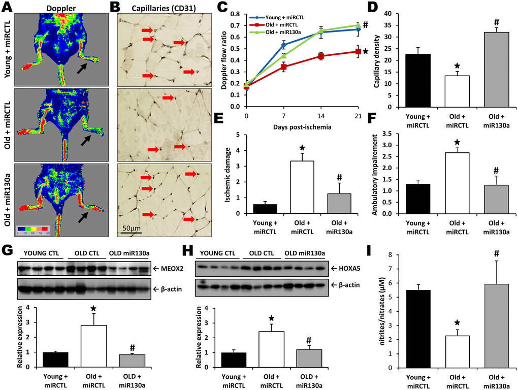 We have previously demonstrated that neovascularization and blood flow recuperation following ischemia are impaired with aging [6]. To study the potential therapeutic effect of miR-130a in vivo, hindlimb ischemia was surgically-induced in old and young mice and blood flow perfusion was assessed by Laser Doppler perfusion imaging (LDPI). As shown on Figure 4A, 4C, blood flow recovery was significantly impaired in old vs. young mice at day 21 after surgery (Doppler flow ratio (DFR) 0.48±0.05 vs. 0.67±0.06; p<0.05). However, old mice treated intramuscularly with a miR-130a mimic demonstrated improvement of blood flow recuperation compared to old mice treated with a scrambled miR mimic control (DFR 0.70±0.02 vs. 0.48±0.05; p<0.05). A similar effect was also observed in microvessels, where aging was associated with a 40% reduction of capillary density whereas intramuscular injection with miR-130a mimic restored vessel densities in the ischemic muscles of old mice (Figure 4B, 4D). Clinically, these effects correlated with reduced ischemic damages (ischemic score 1.25 vs. 3.33, Figure 4E) and improved mobility (ambulatory impairment score 1.25 vs. 2.67, Figure 4F) in old mice treated with miR-130a mimic. miR-130a has previously been shown to directly target and induce post-transcriptional repression of the antiangiogenic homeobox genes MEOX2 (GAX) and HOXA5 [18]. We found that MEOX2 and HOXA5 expression are significantly increased (2.8 fold and 2.4 fold increase, respectively) in the ischemic muscles of old mice compared to young mice. However, treatment of old mice with miR-130a mimic can reduce the expression of these antiangiogenic factors (Figure 4G, 4H). Nitric oxide (NO) is essential for the maintenance of endothelial function and has also been shown to be important for postnatal neovascularization [19]. Here we found that NO bioavailability is reduced by 59% in the blood plasma of old vs. young mice, but that its expression is rescued in old mice that are treated with miR-130a (Figure 4I).