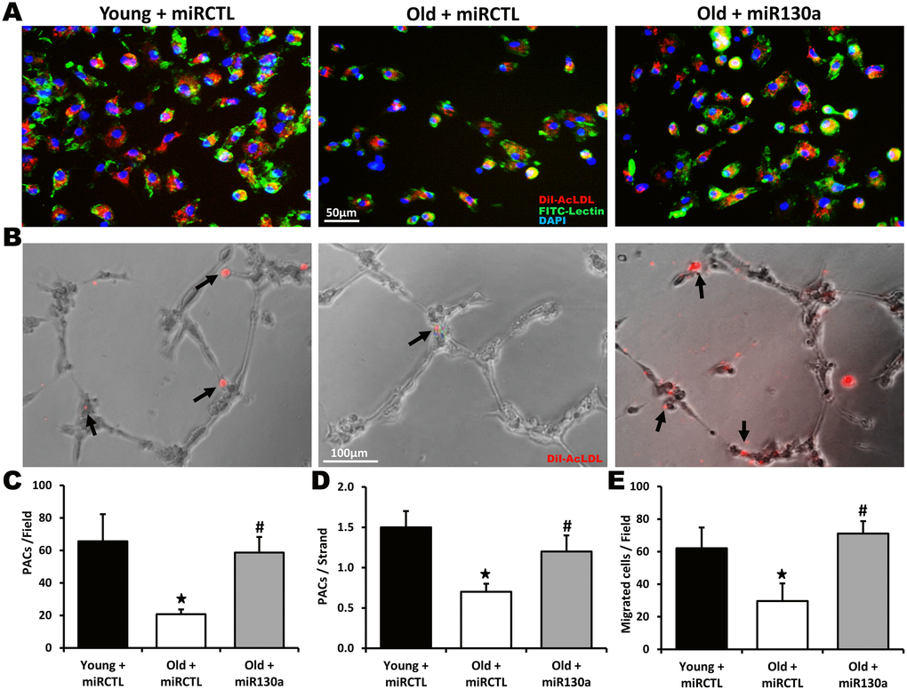 Bone marrow-derived PACs can reach ischemic tissues and contribute to the formation of new blood vessels [5]. However, the number and the angiogenic activities of PACs are impaired in older patients with atherosclerotic diseases [9–11]. Here we found that the number of PACs is significantly reduced (68% reduction) in old compared to young animals (Figure 5A, 5C). Moreover the angiogenic activities of PACs including integration into endothelial cell tubules (53% reduction, Figure 5B, 5D) and migration (52% reduction, Figure 5E) were all impaired in older mice. However, treatment with miR-130a mimic restored the number and the angiogenic activities of PACs in older mice (Figure 5A–5E).